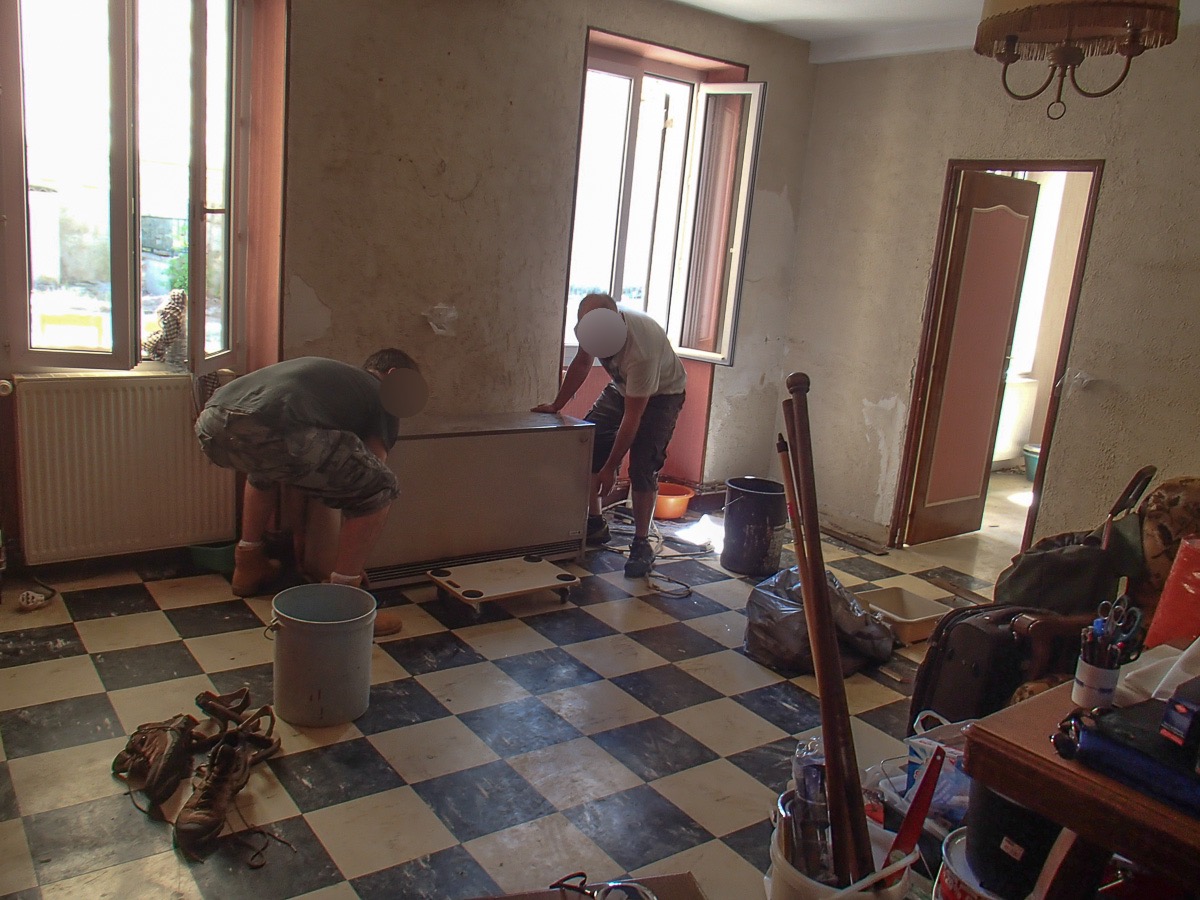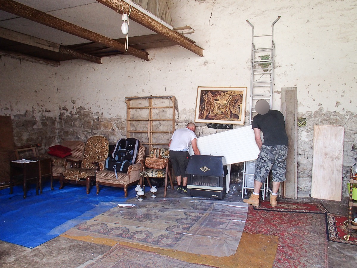 D’abord on enlève tous les meubles encombrants, on vidange les radiateurs et on les décroche puis on met le tout dans la grange. Un diable aurait aidé mais finalement une planche à roulette tirée par une corde fait l’affaire. Dans la grange tout est posé sur des bâches.