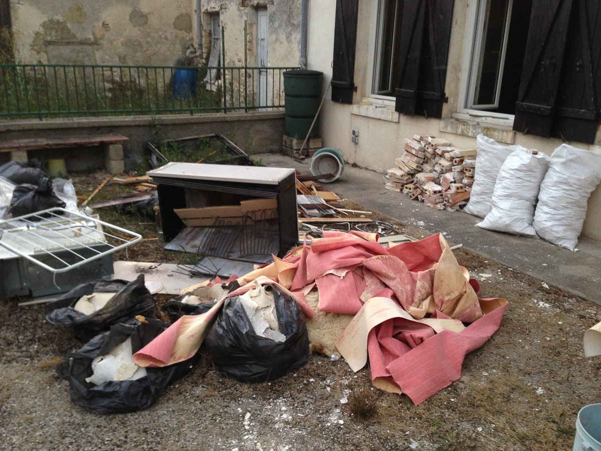 Les restes de moquette rose, de brique de la cloison détruite et diverses férailles s’amoncellent dans la cour.