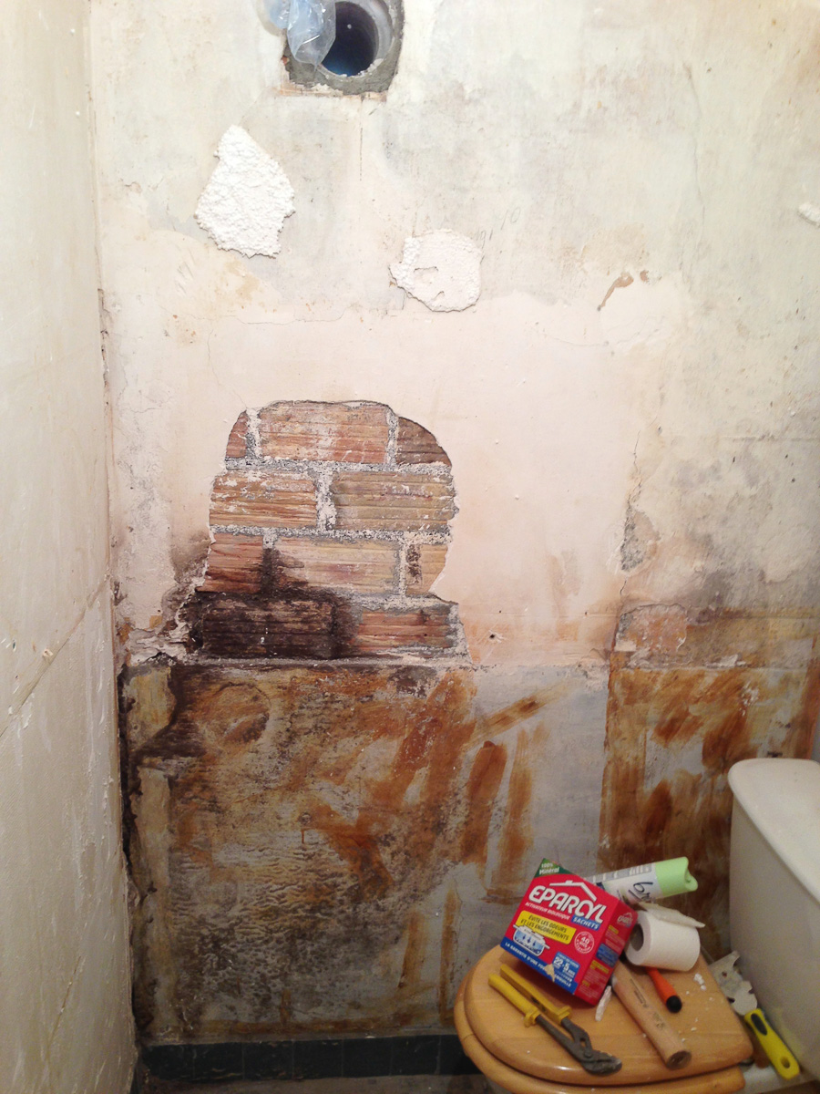 La double cloison de polystyrène est déposée. Laissant apparaitre un mur de brique nu (l’enduit au plâtre était lui aussi désagrégé), ainsi qu’un enduit ciment sans doute pour lutter contre l’humidité là où le mur porteur est enterré.