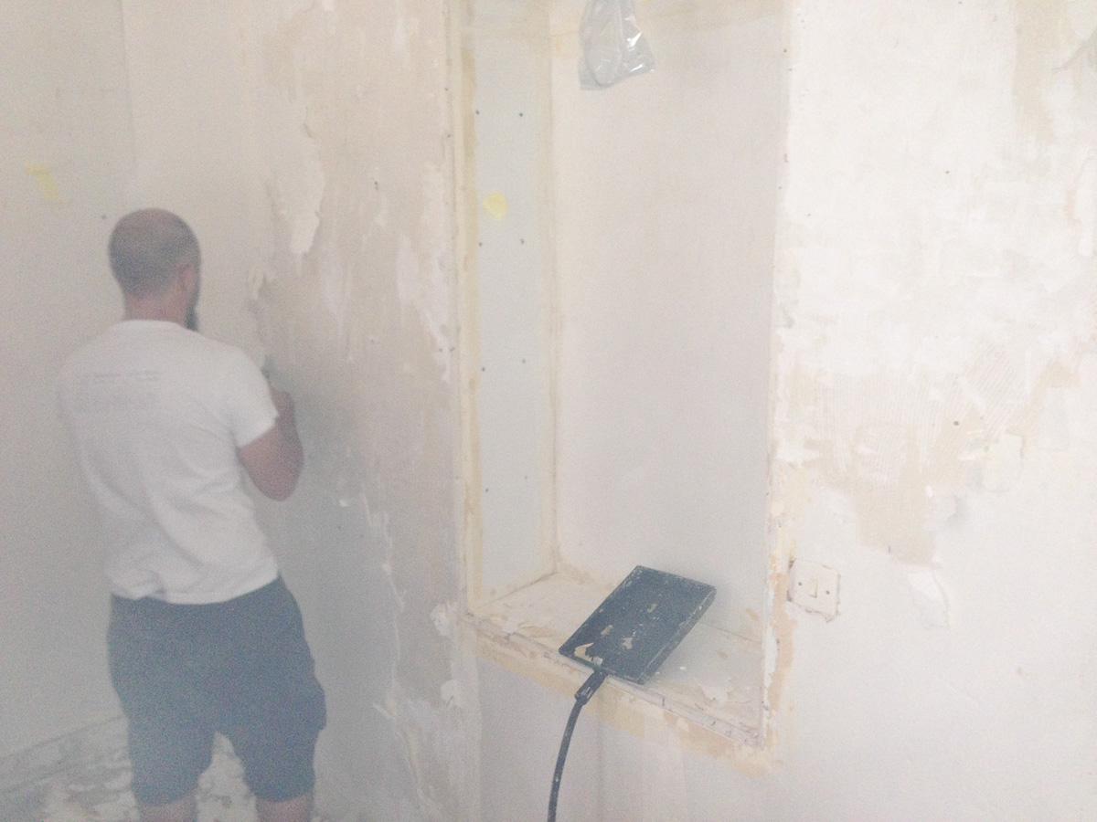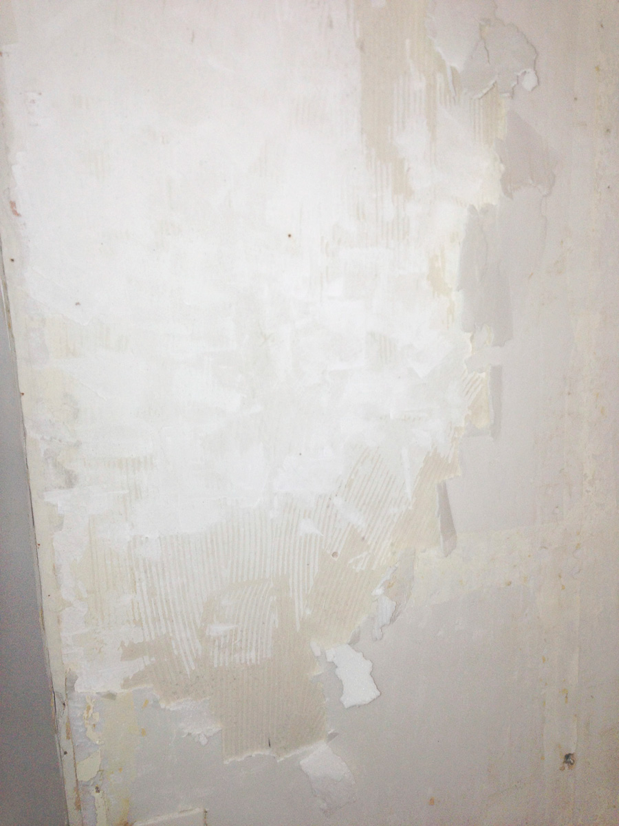 Une couche de polystyrène recouvre les murs du fond porteurs. Sans doute pour isoler et éviter l’effet « mur froid » que nous allons sans doute constater cet hiver. Le polystyrène est peu dégradé et j’hésite à l’enlever. Finalement la décision est prise de tout enlever. Une épaisse couche de colle a été appliquée à la spatule crantée. Cette couche est impossible à enlever sans dégrader les murs. Sous la colle, on aperçoit des tâches noires de moisissure.