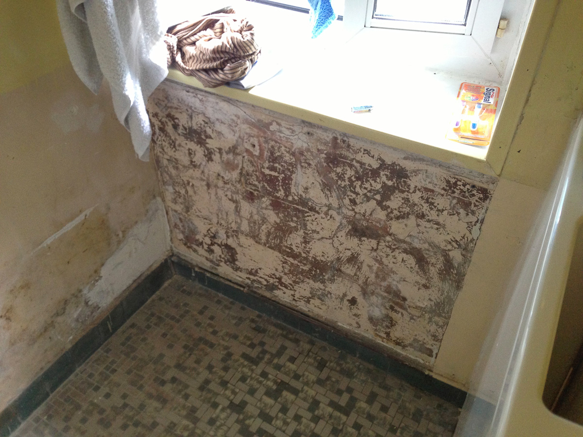 Sous la fenêtre de la salle de bain, un enduit ciment, que je soupçonne d’être hydrofuge. Cette partie est enterrée, l’enduit doit bloquer les infiltrations.