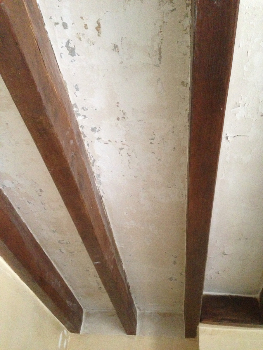 La peinture entre les solives a été grattée. Celle ci s’écaillait. Humidité ou efforts sur le faux plafond? L’avenir nous le dira.