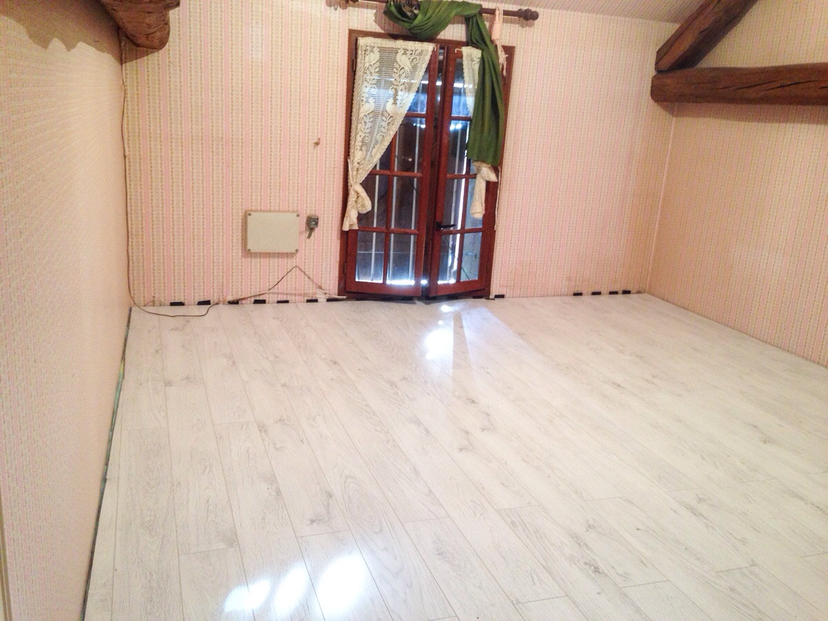 Ça y est le parquet est posé…enfin. Ça aura duré 9 heures. J’allais plus vite mais la pièce est plus grande. Toujours les même étapes: sous couche, mur pas droit, on prend la perpendiculaire au mur de la fenêtre…ça avance vite jusqu’aux découpes obliques, malheureusement requises des deux côtés de la pièce.