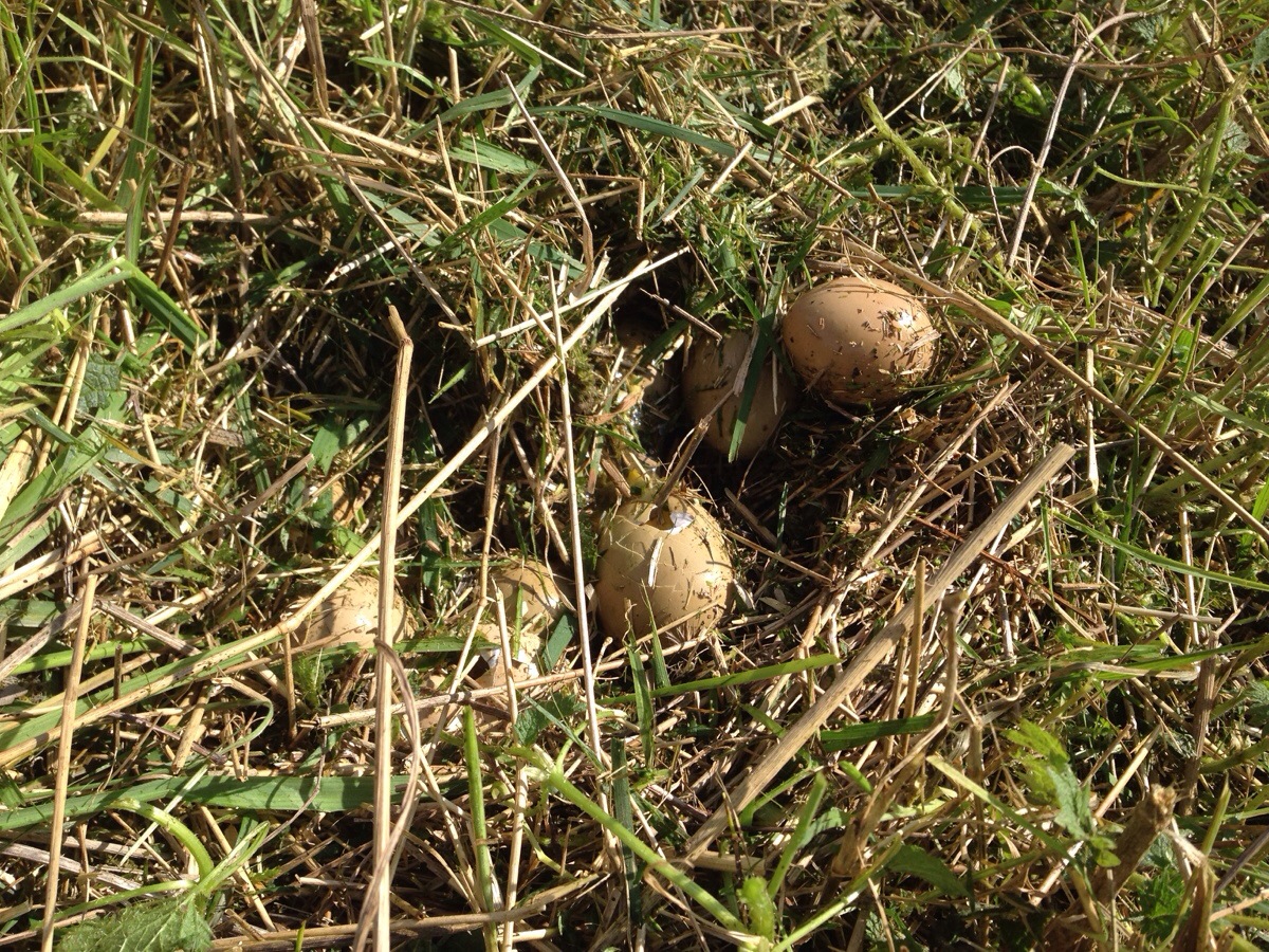 J’ai appris trop tard de la part du voisin qu’un couple de faisans communs (sauvages) nichaient dans la friche derrière la grange. Le nid a subit quelques dommages au passage de la
