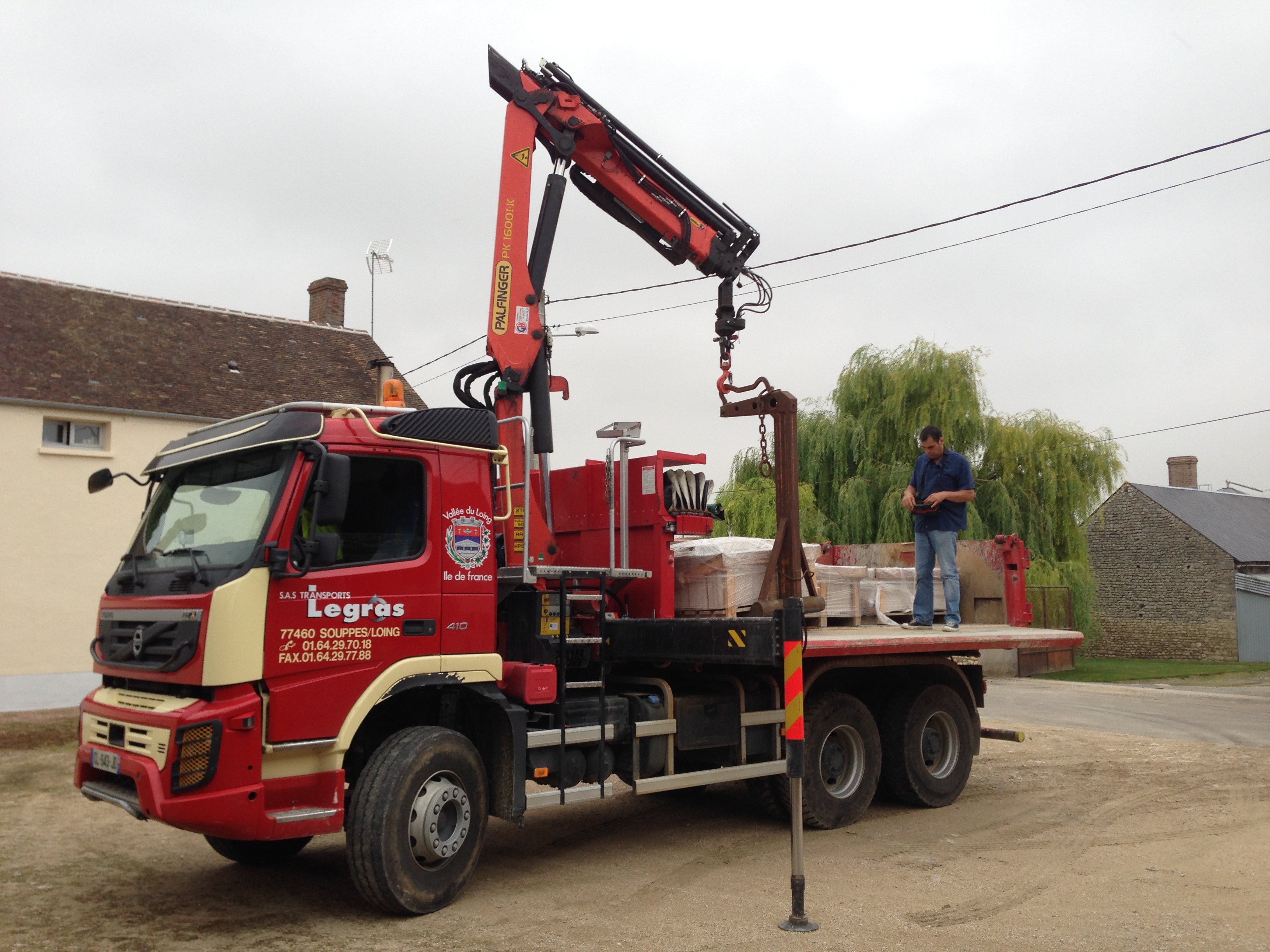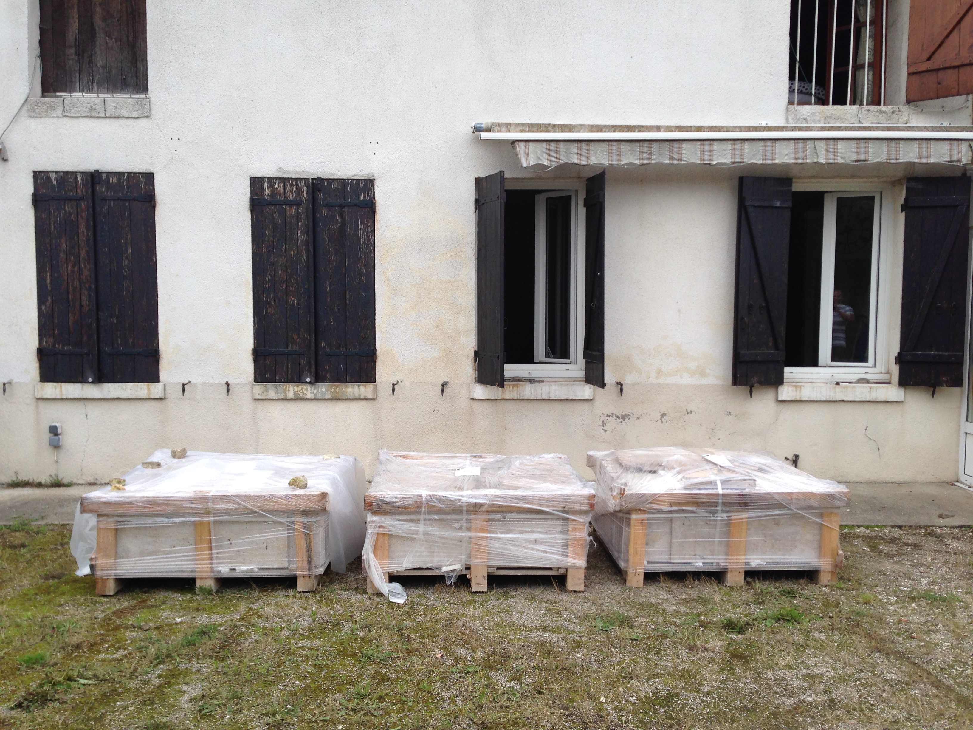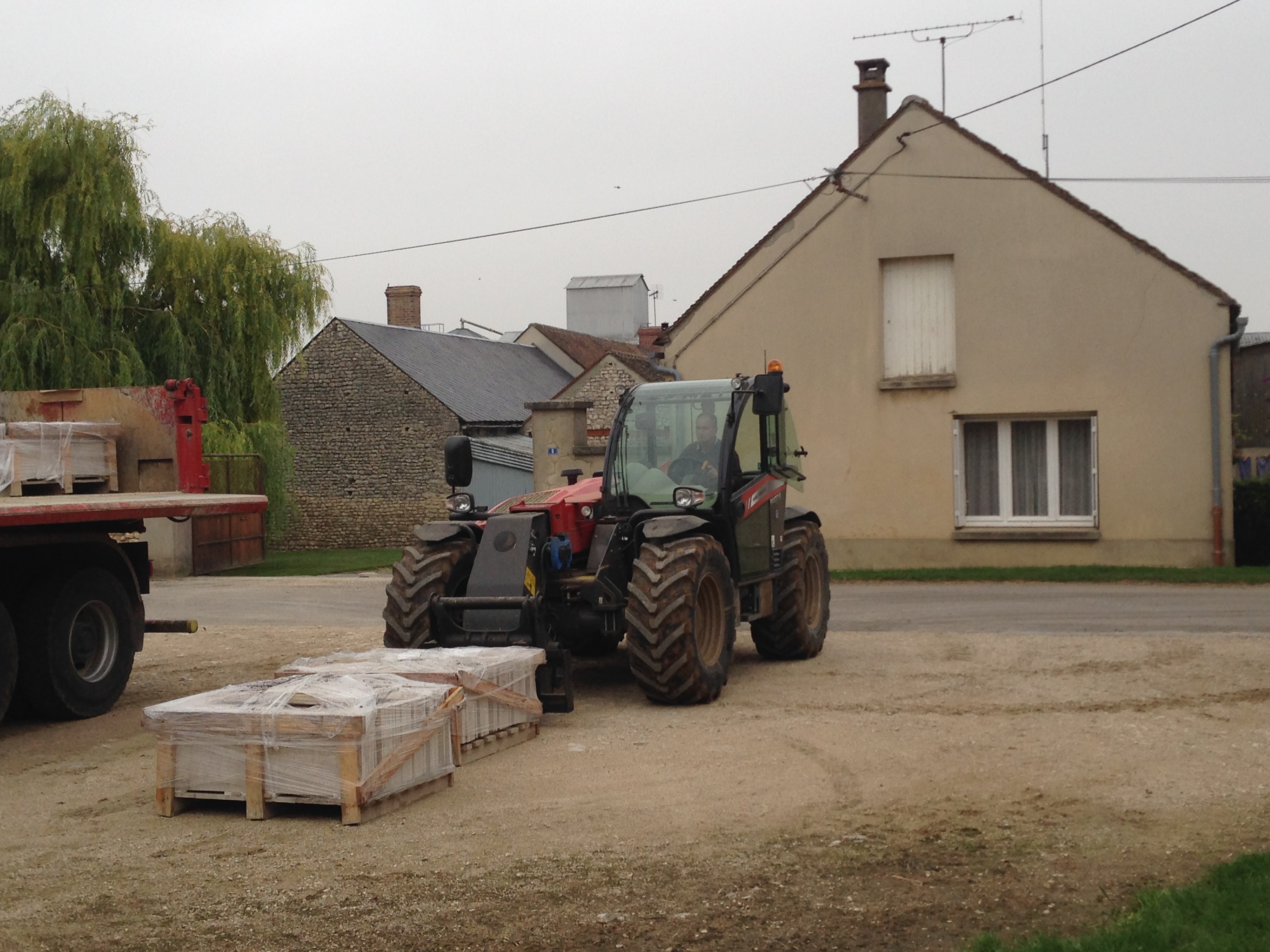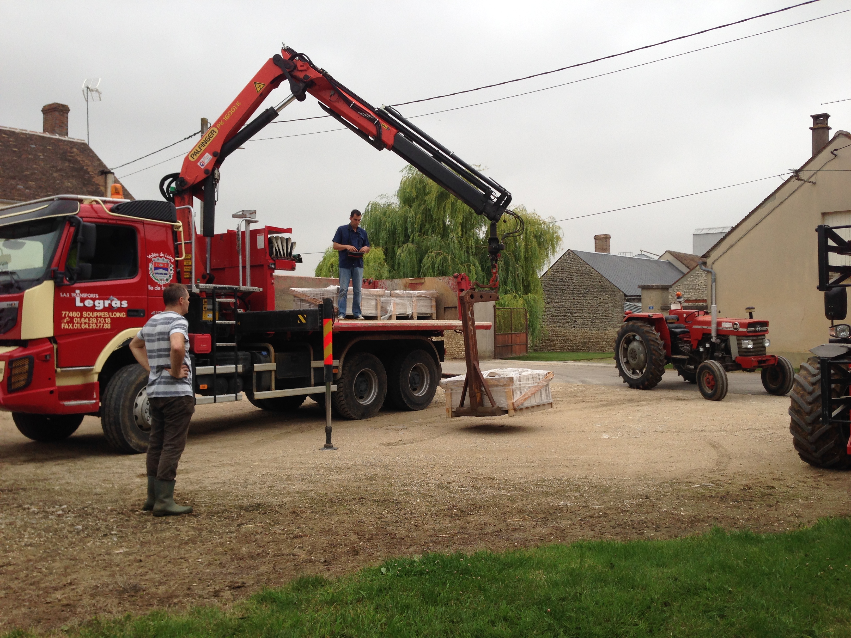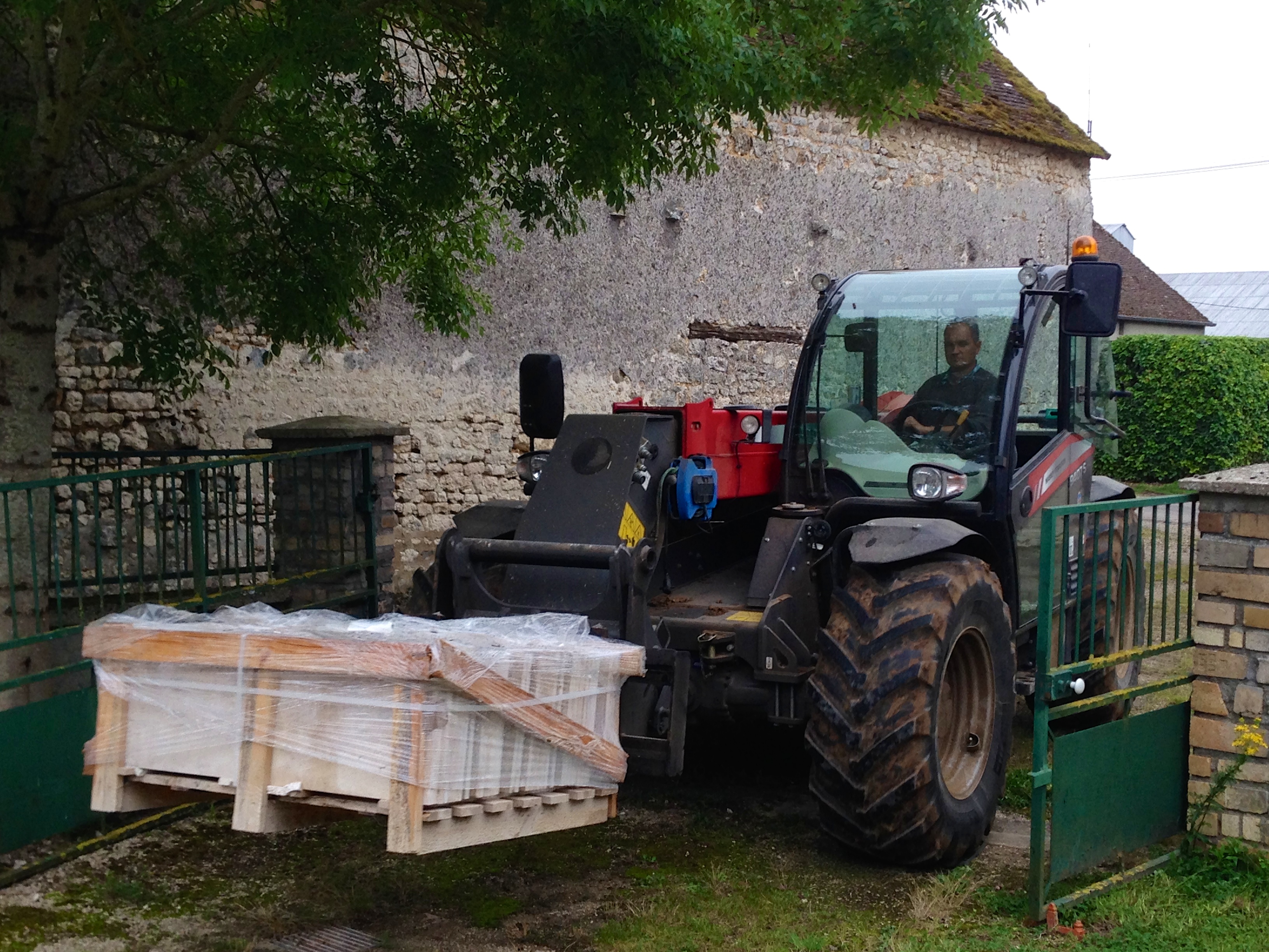 Livraison des 70 m2 de Pierre de Souppes. Largeur : 40 cm, épaisseur 2 cm, longueur libre. Le transporteur est venu avec son plus petit camion, un 10 tonnes, mais il n’a pas pu reculer dans la cour. Il a déposé sur la « place » et les voisins qui passaient par là ont pris le relais avec leur transpalette. 3 palettes ont été livrées, pour un poids de 3,5 tonnes.
