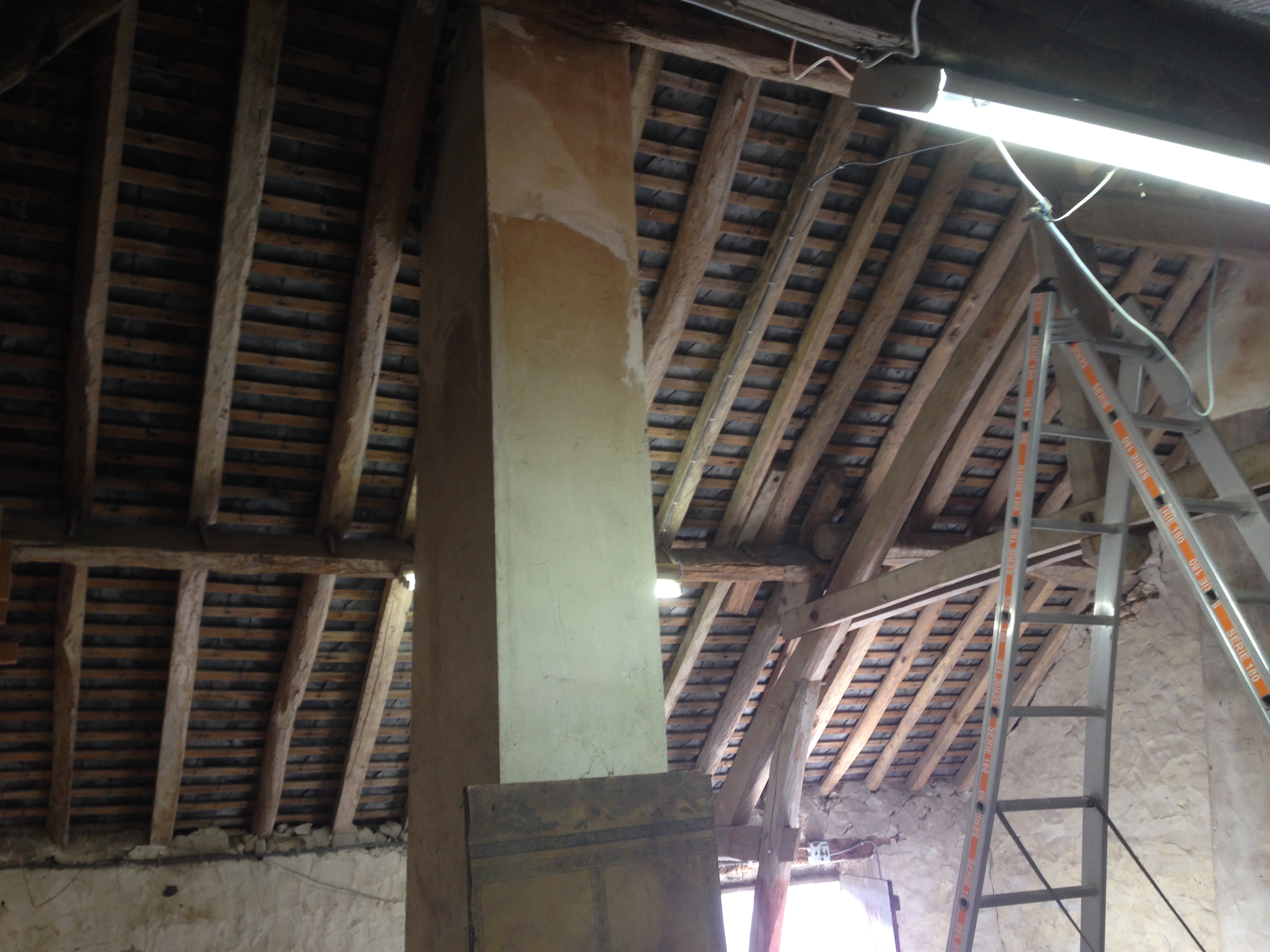 La charpente a l’air propre et sèche, mais il faut traiter contre les insectes et il y a toujours la question de la panne intermédiaire à doubler. J’ai aussi remarqué que la panne faitière était attaquée à un endroit 🙁 Pas rassurant.