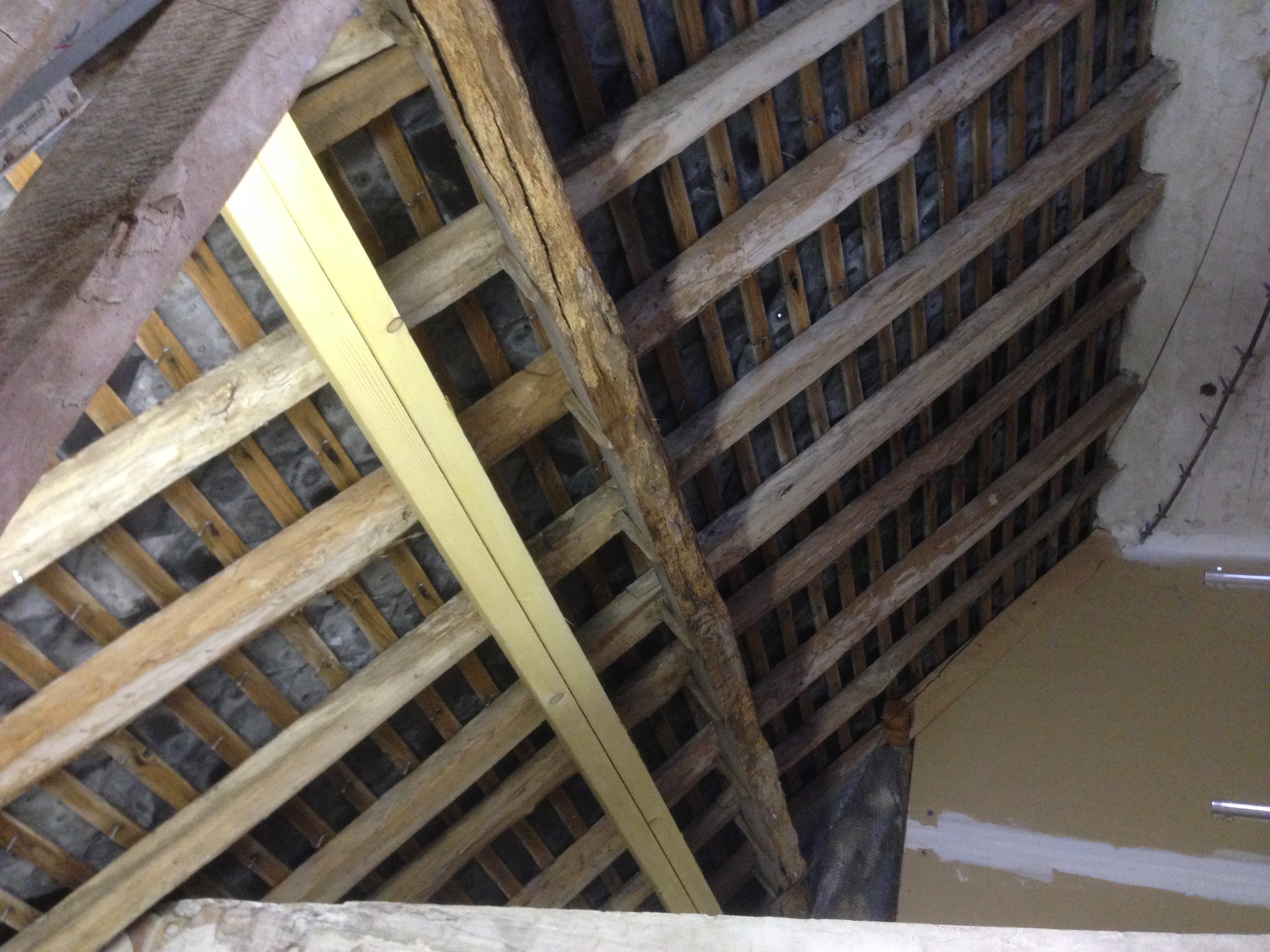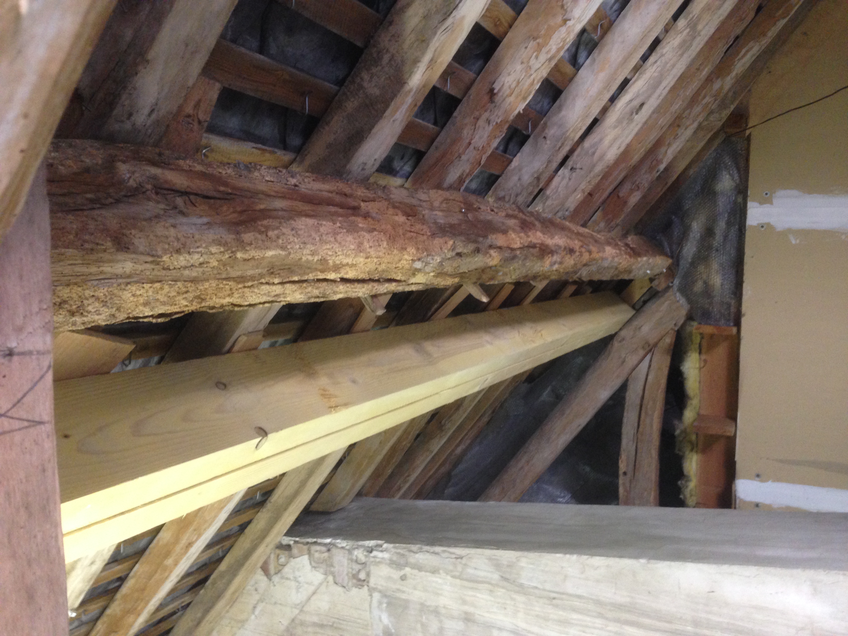 Une des pannes intermédiaires est ben attaquée par les insectes. Je la double avec 2 madriers de 4m de long, de section 63×160 mm.