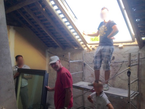 2 Velux SK08, soit de dimensions 114cm x 140cm sont posés dans le grenier. Chaque fenêtre pèse 75 kg, c’est dire l’ampleur du chantier! L’essentiel du travail est quand même fait à 2, et ponctuellement à 4 avec l’aide d’Eric et de son fils Gautier lors des phases critiques (à savoir la montée et positionnement de l’ouvrant dans le cadre à 3 mètres du sol)