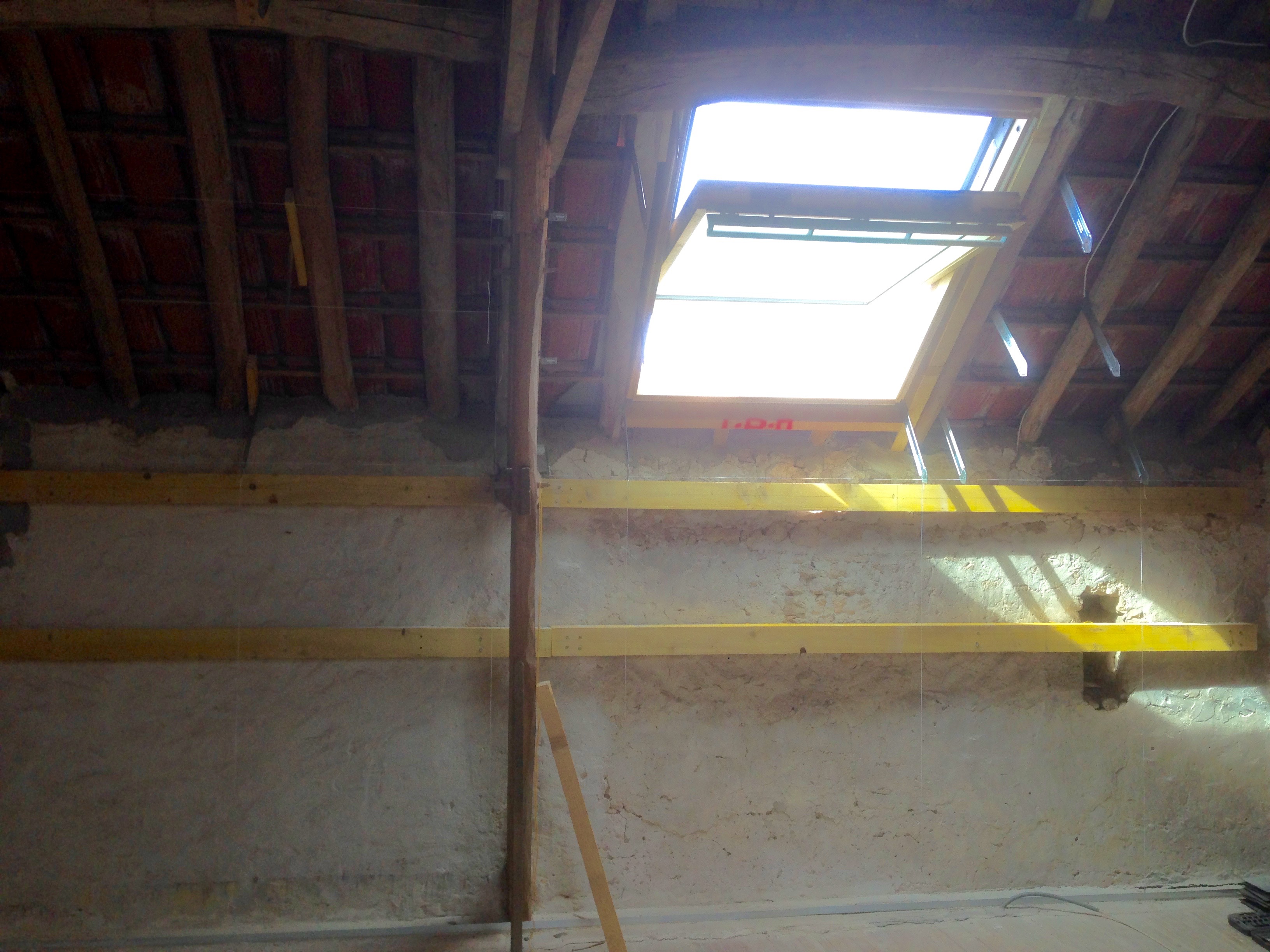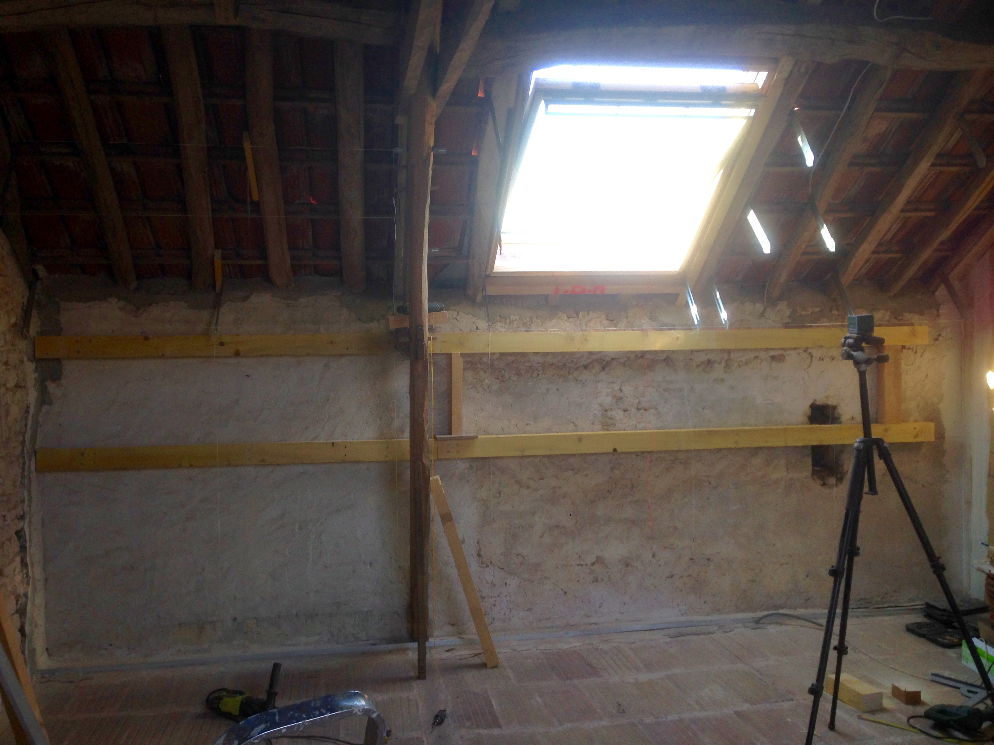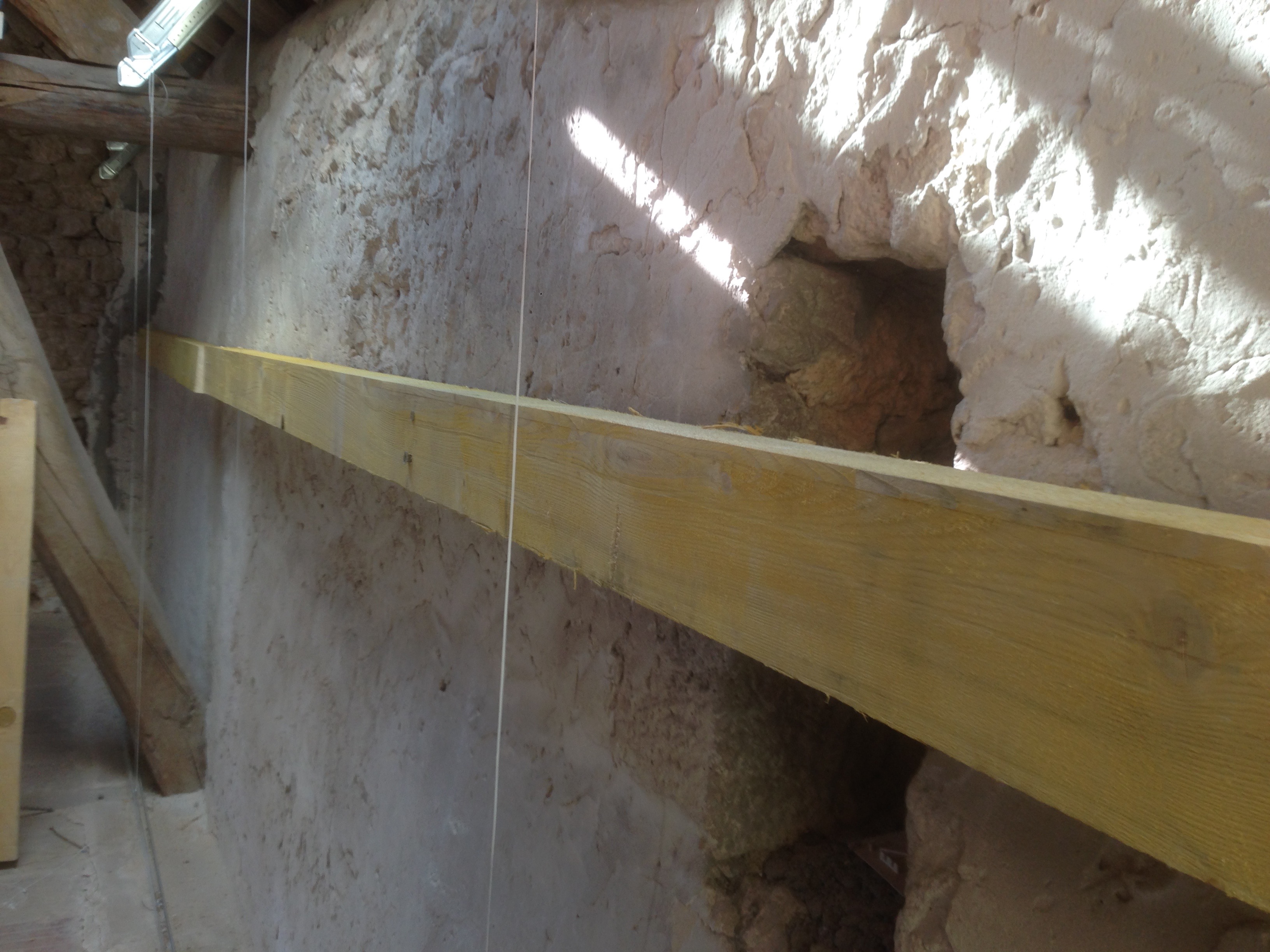 Pour pallier à cela j’ai fixé les gros chevrons dont je ne me suis pas servi (j’avais pris des longueur 6m, avec une section de 8×11, c’est du lourd). J’ai découpé des longueurs de 2m et 3m pour couvrir les 5m de longueur de pied droit, et je les ai fixés à une hauteur de 1m et à 1m 50. J’ai utilisé des chevilles à frapper de 14cm, mais derrière le mur n’est pas très fiable car le mortier de scellement des pierres ne permet pas une bonne accroche. Du coup faut viser les moellons mais c’est aléatoire.