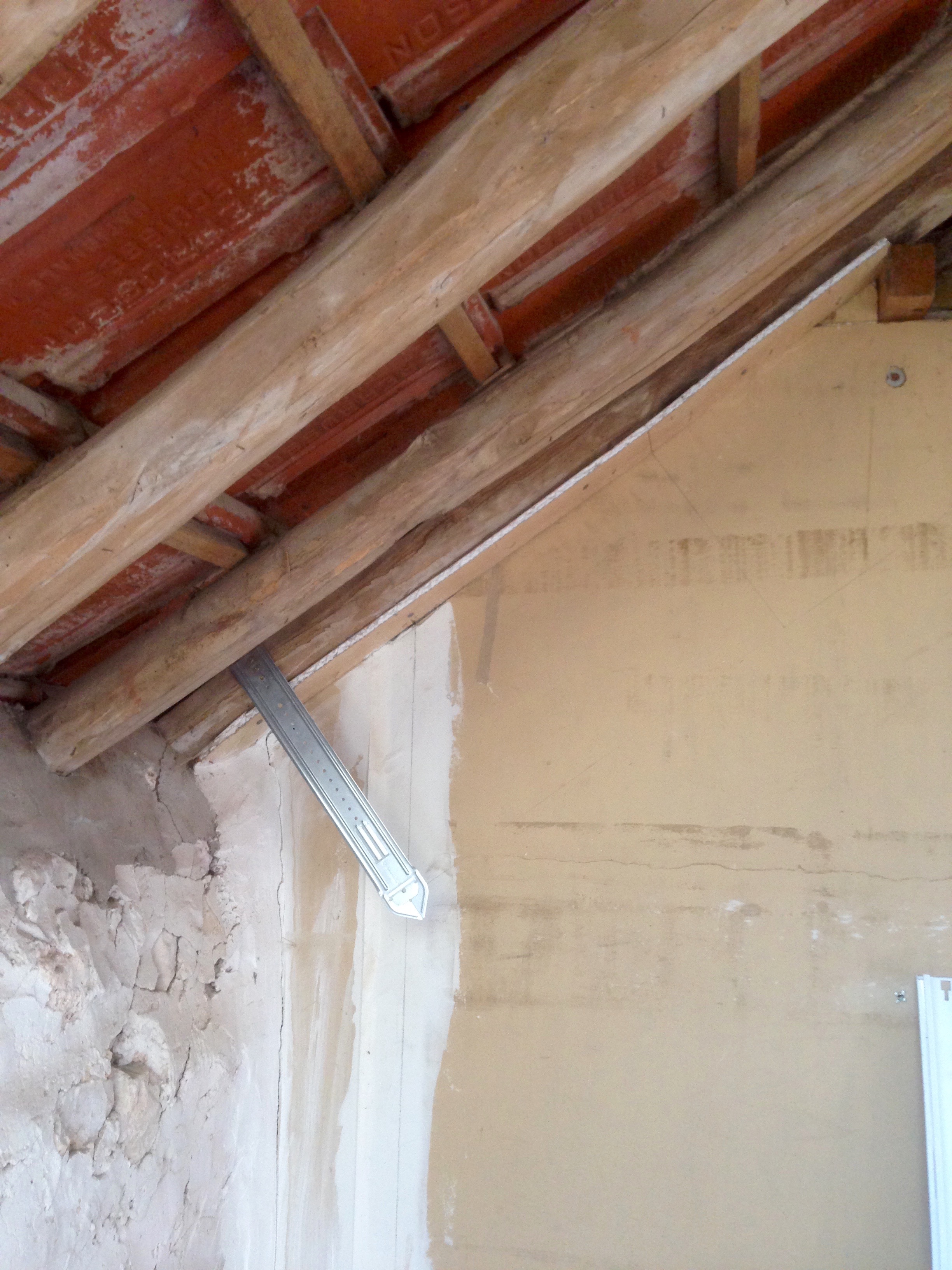 Autant dire que c’est du bricolage à tous les étages car comme déjà maintes fois expliqué, les chevrons sont ronds, pas droits, pas fiables quoi. Donc pour aligner les suspentes c’est coton. Aucun référence n’est possible, ni le mur, ni le sol, ni rien, bref c’est la zone.
