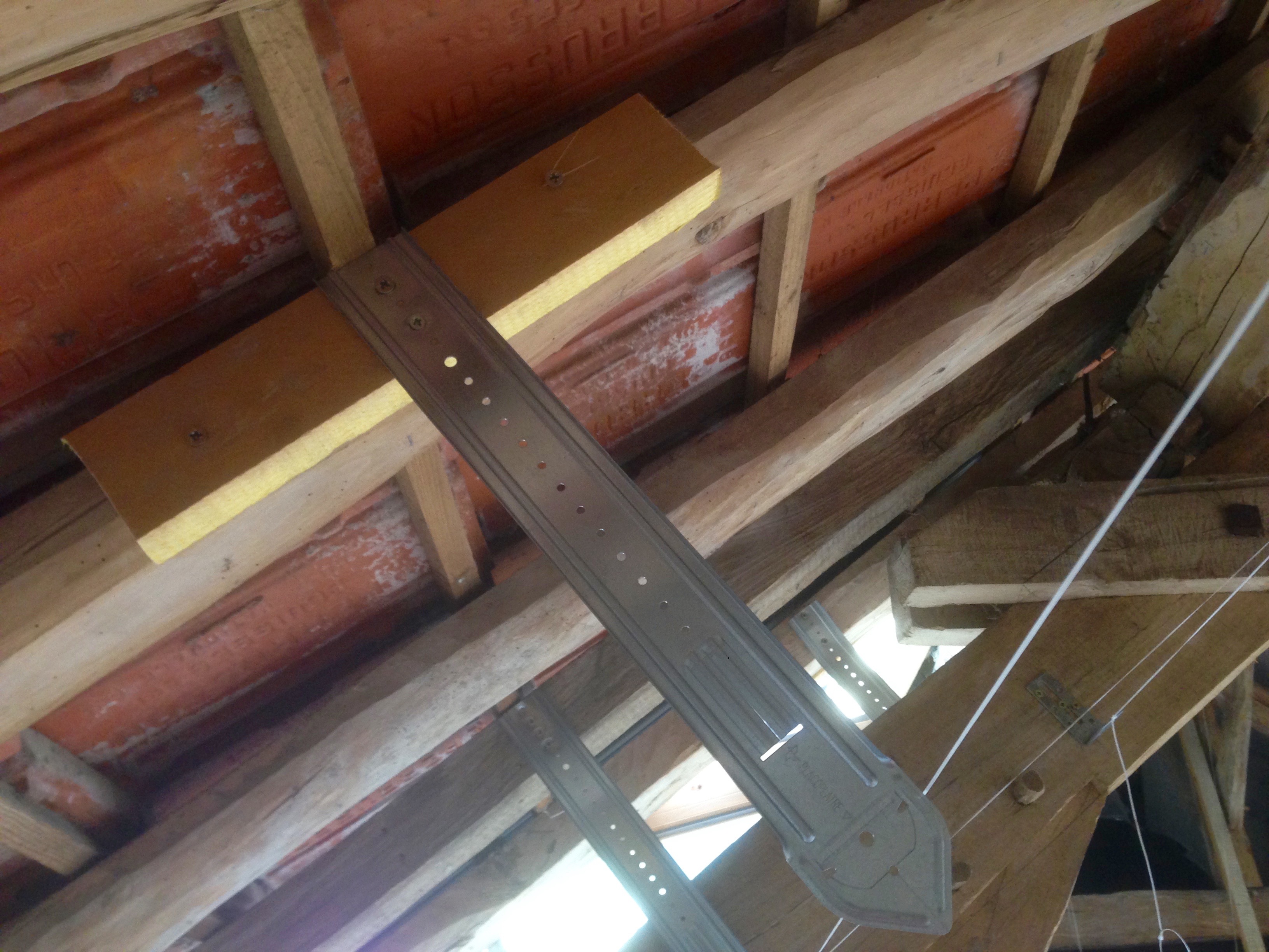 Des suspentes de 42 cm de long sont positionnés et vissées sous les chevrons pour supporter la charge : de 30 cm de laine de verre posée en 2 couches (16 cm + 14 cm) et les fourrures puis les plaques de plâtre.