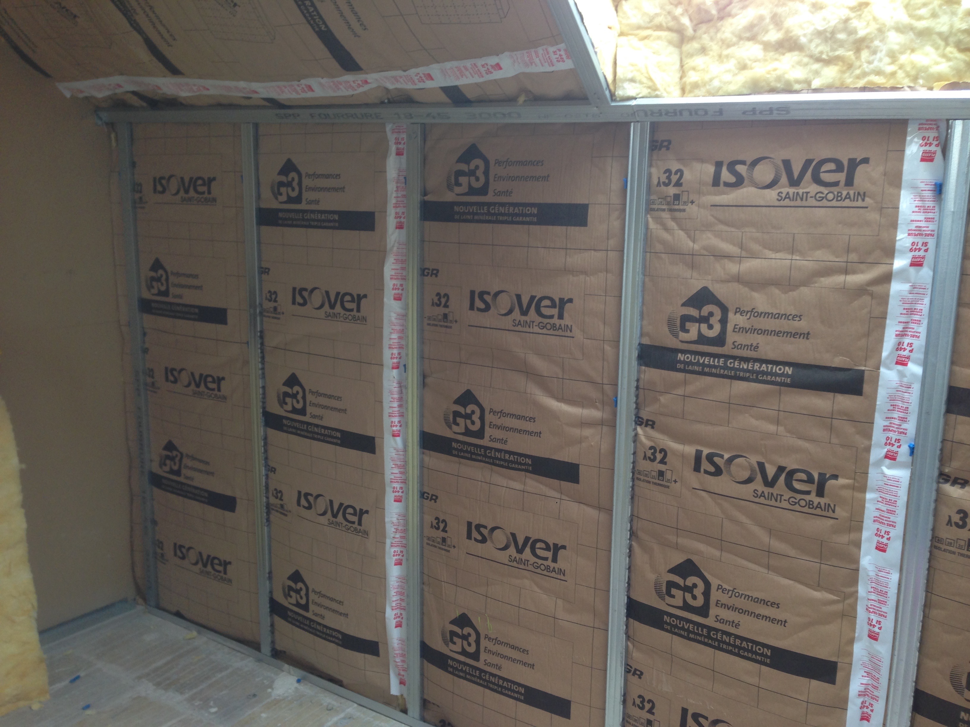 La fourrure, est coupée à la grignoteuse et ramenée à la bonne hauteur. Elle se clipse verticalement sur les 2 appuis. Dans la partie haute, un connecteur vient relier la fourrure à la première fourrure horizontale des rampants. En bas, la fourrure se loge dans des « lisses » (sorte de rails asymétriques), qui sont fixées au sol. L’ensemble ainsi formé est très résistant en pression horizontale, je peux m’appuyer dessus sans problème. Heureusement car c’est un peu le but : que la cloison ne s’enfonce pas quand on appuie dessus.