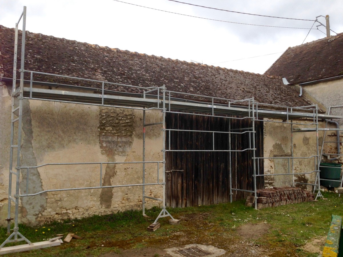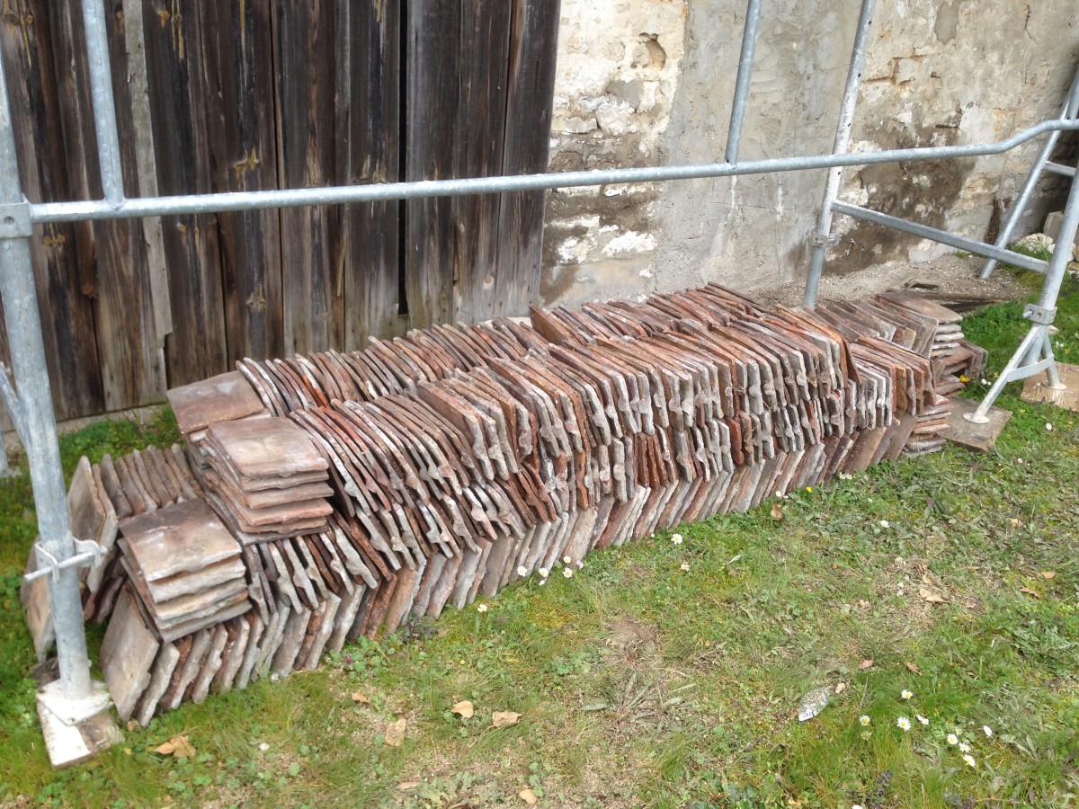Après un long périple d’un peu plus de 1 an, les travaux de rénovation démarrent. Le choix s’est porté sur le devis le moins cher, qui est celui d’un maçon recommandé par les voisins, un jeune qui s’est récemment mis en auto-entreprise. On démarre donc par la toiture. Dépose totale, on change les liteaux qui sont dégradés, et on repose les tuiles. Les tuiles anciennes sont conservées, les tuiles cassées remplacées par d’autres tuiles anciennes de recul. Sur le versant sud, en tuile mécaniques, on ne fait rien car il est en bon état.