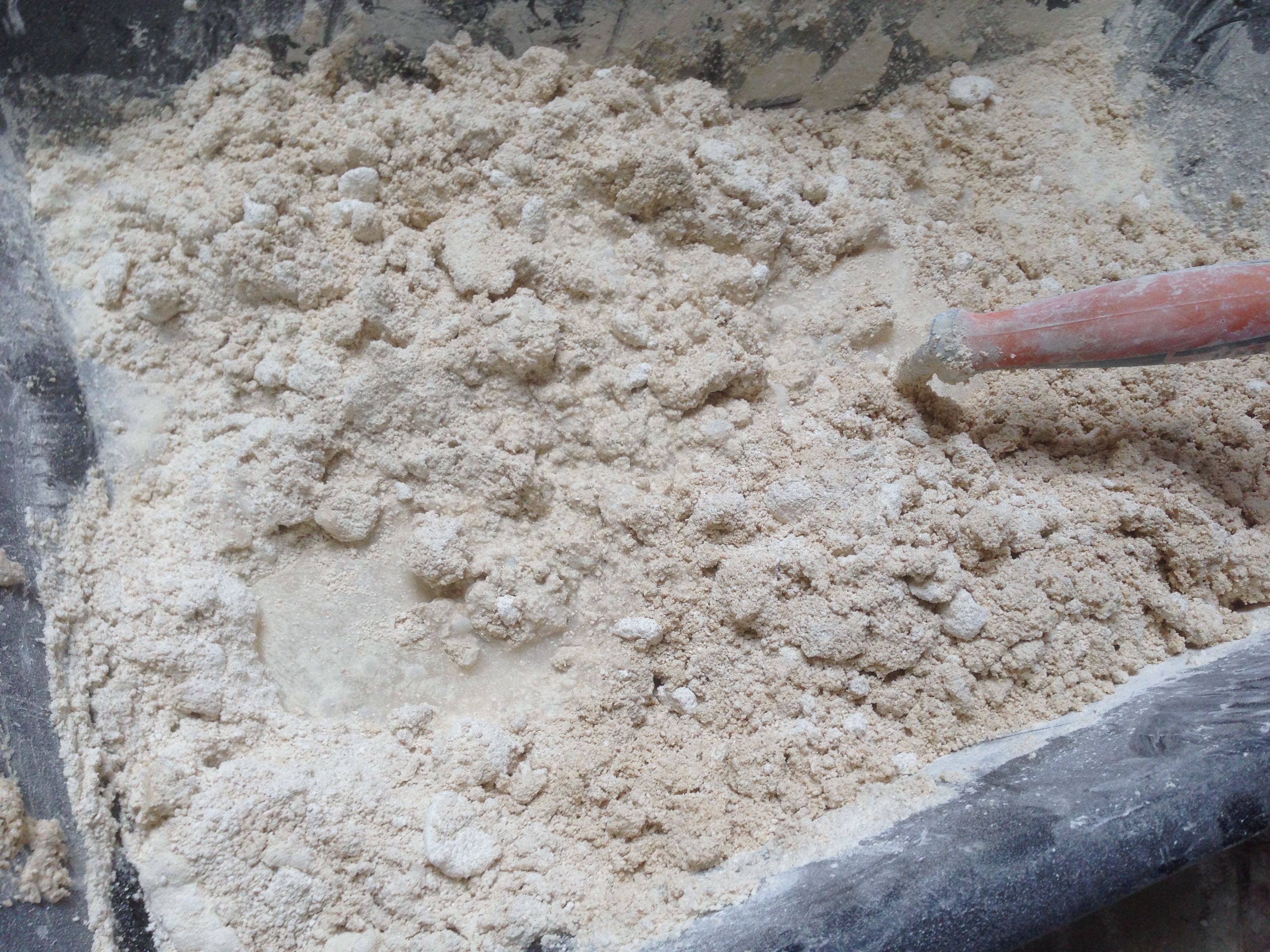L’enduit est gâché à la main dans une auge. Avec un sac de 25 kg, je fais 3 gâchées.