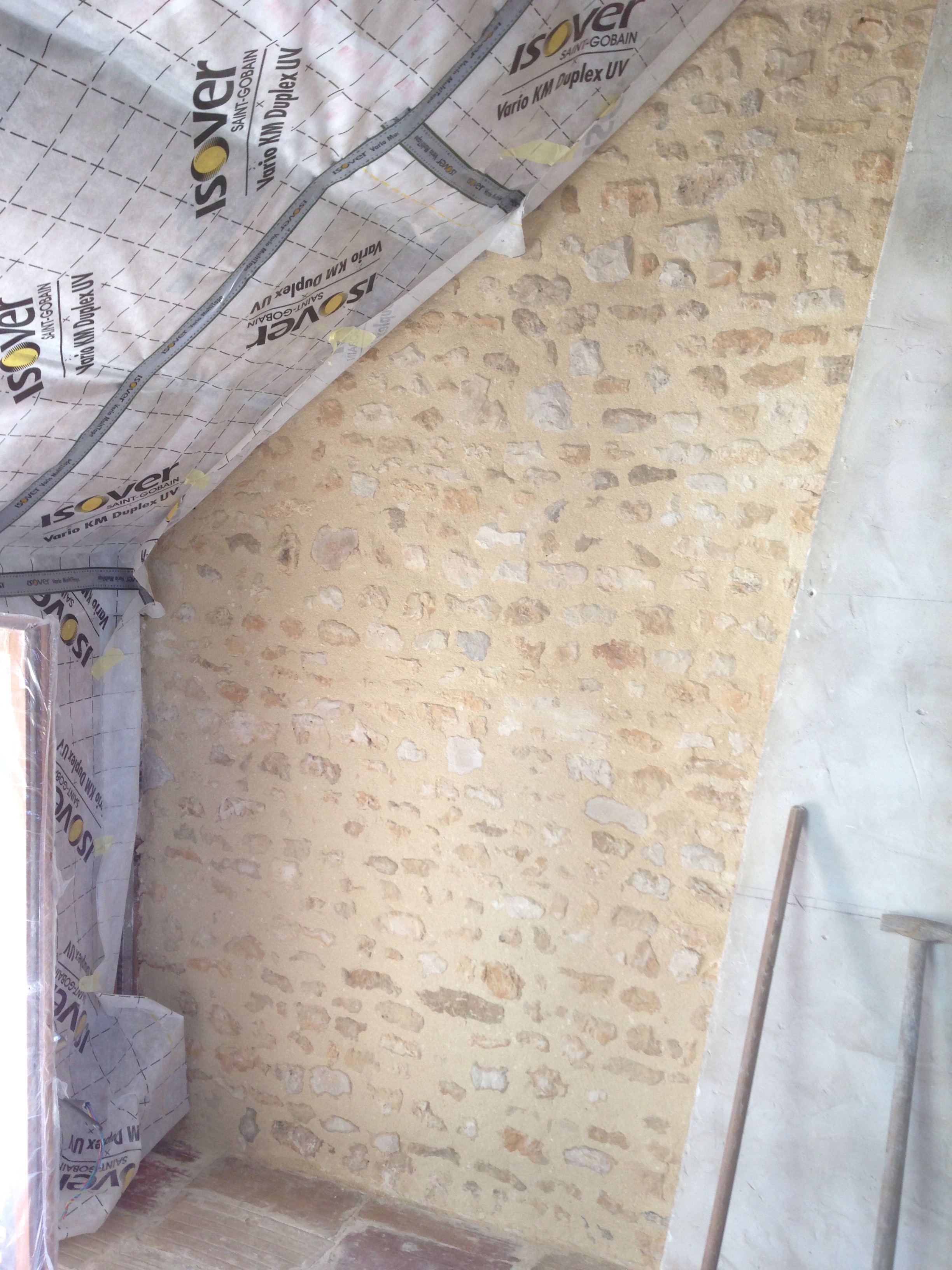 Nous avions également piqué le mur pour décaper l’ancien enduit de plâtre gros : Décapage du mur de refend.