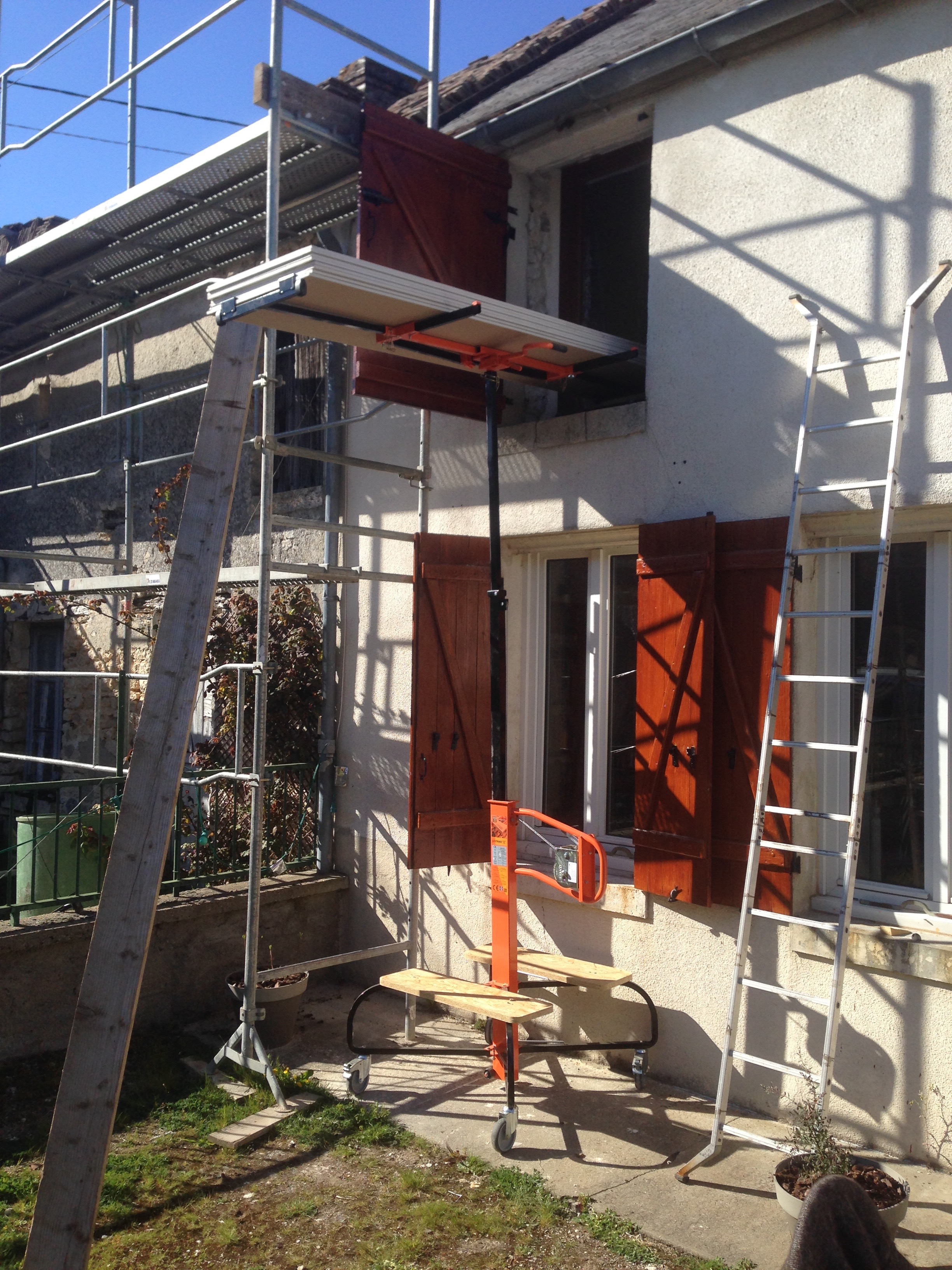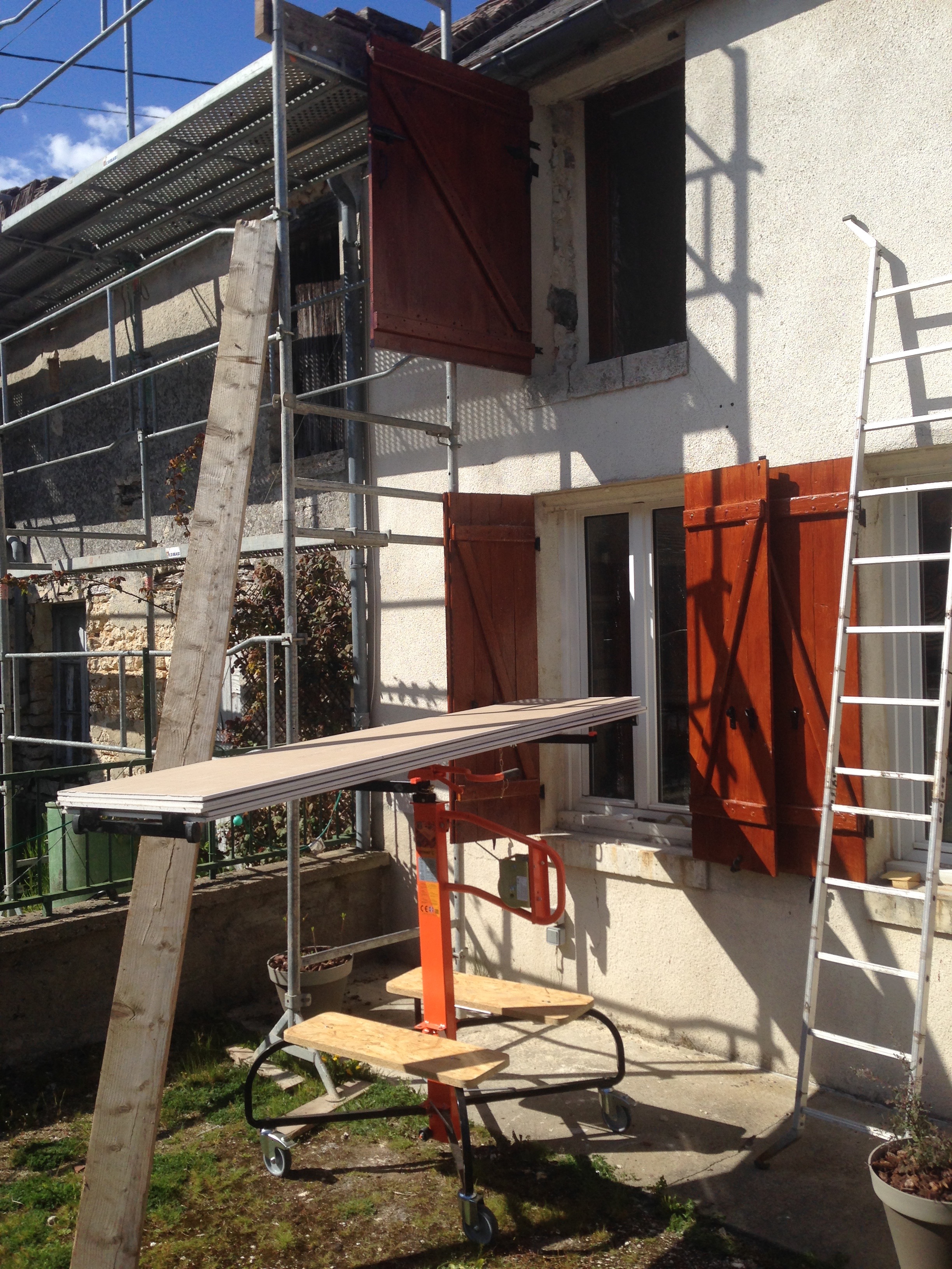 Je monte les plaques de plâtre à l’étage à l’aide du lève plaques. Celui ci permet de monter 75kg à une hauteur de 4mètres. Je les monte par paquets de 8 à l’étage.