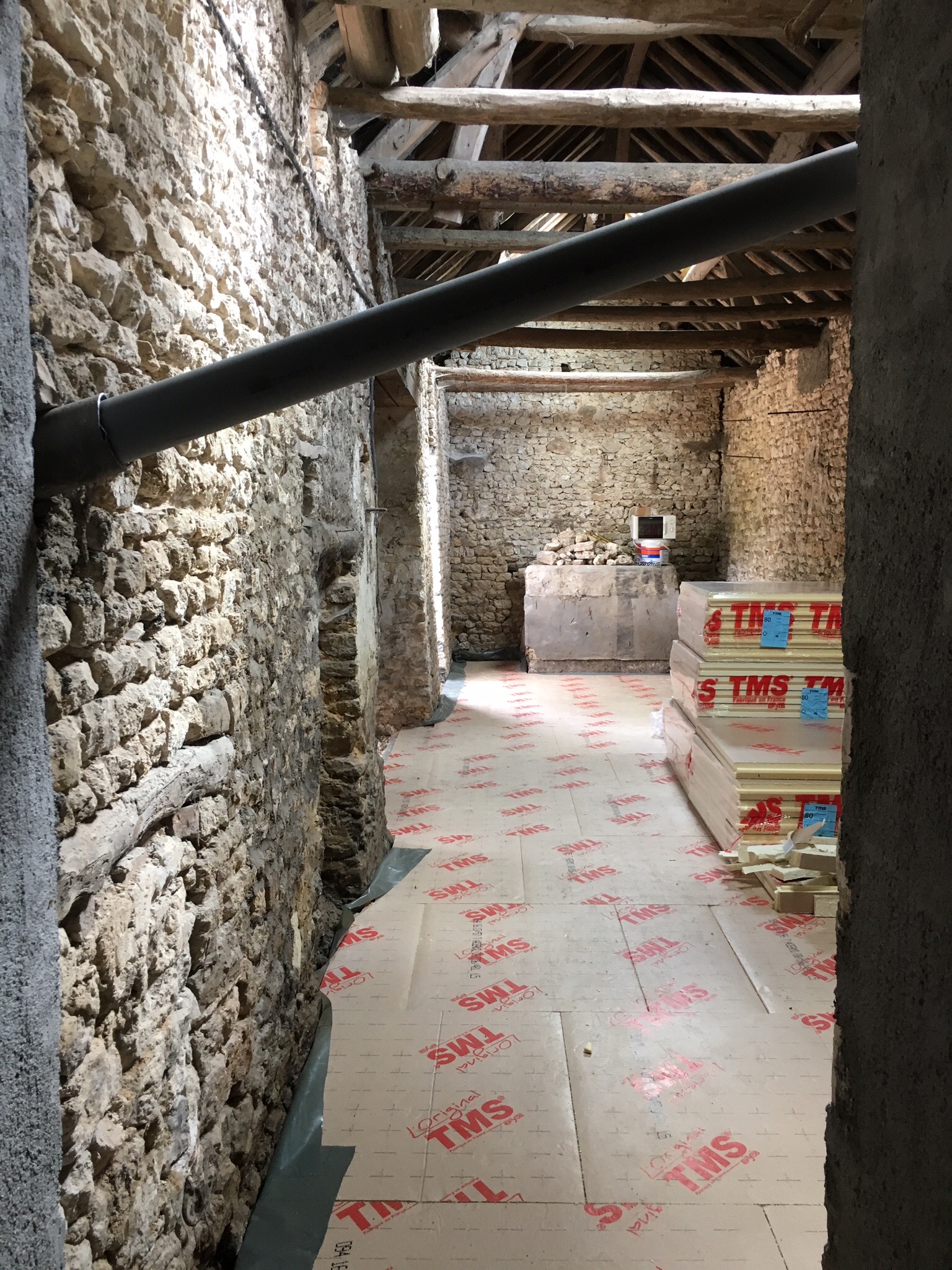 Un isolant d’épaisseur 80mm est posé sous le dallage sur un film ployante. L’isolant offre une résistance thermique de R=4 environ et s’assemble avec un système de rainures et d’encoches. Les panneaux sont ensuite scotchés entre eux.