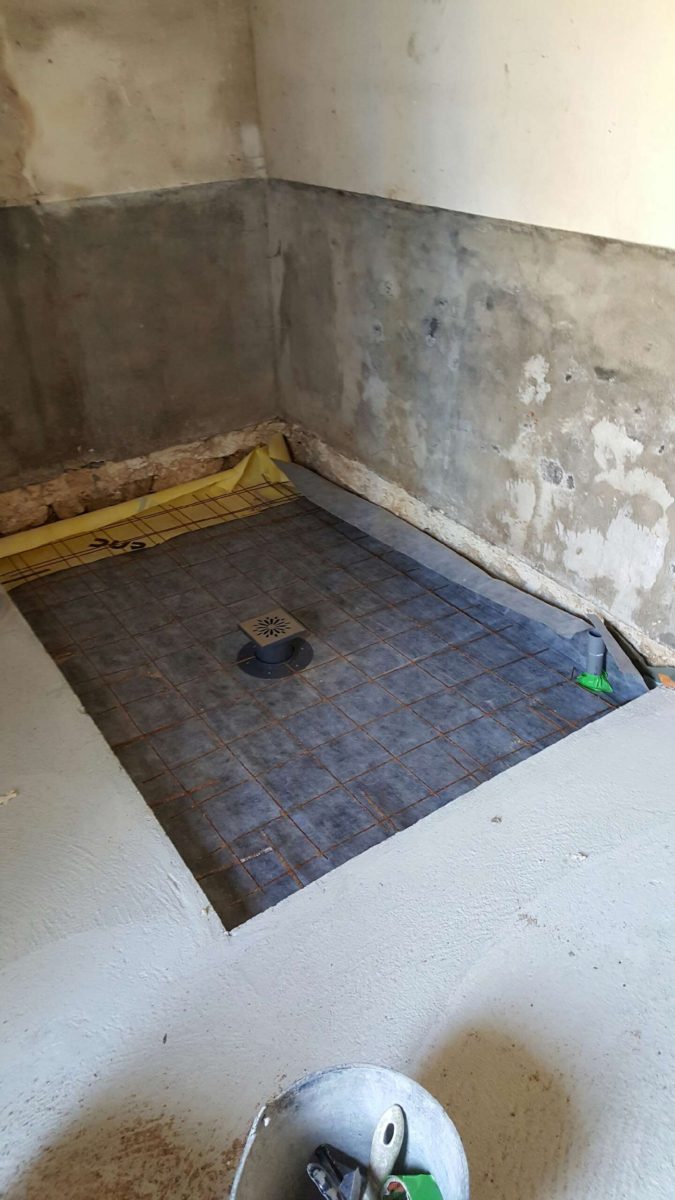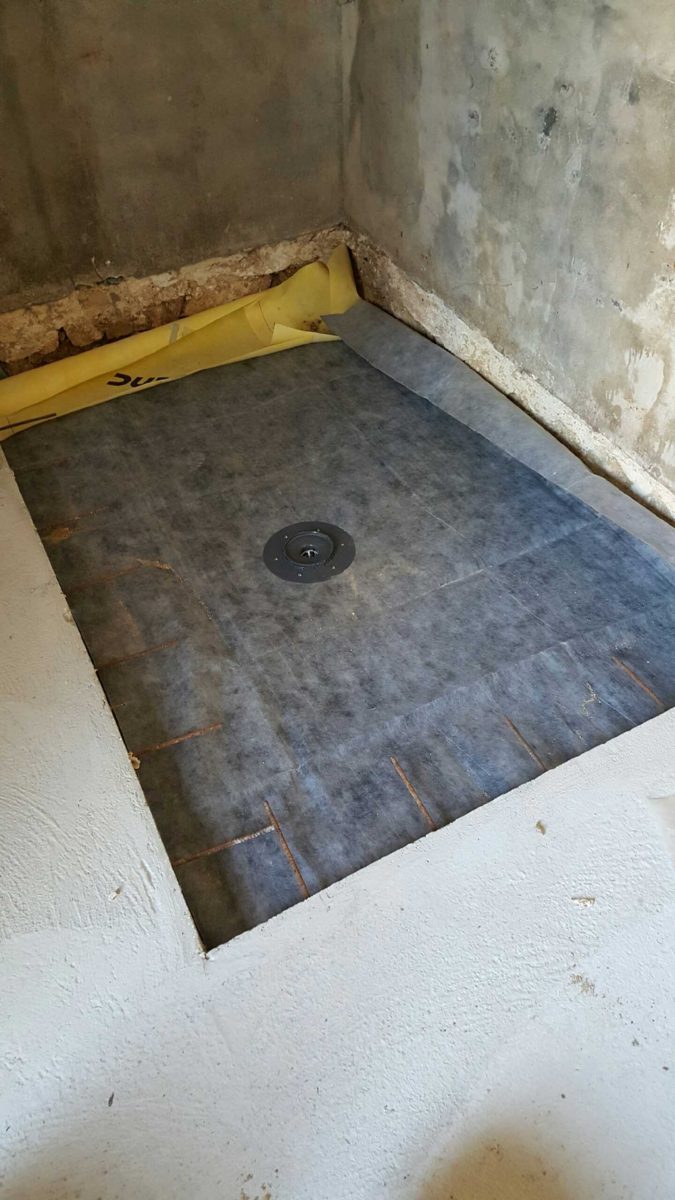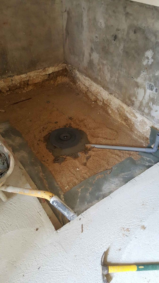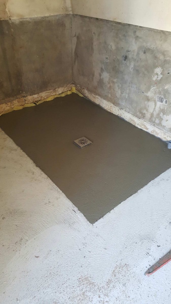 La bonde est placée en assurant l’étanchéité à l’aide d’une natte d’étanchéité placée sous la chape. La chape est coulée avec une pente pour évacuer l’eau vers la bonde.