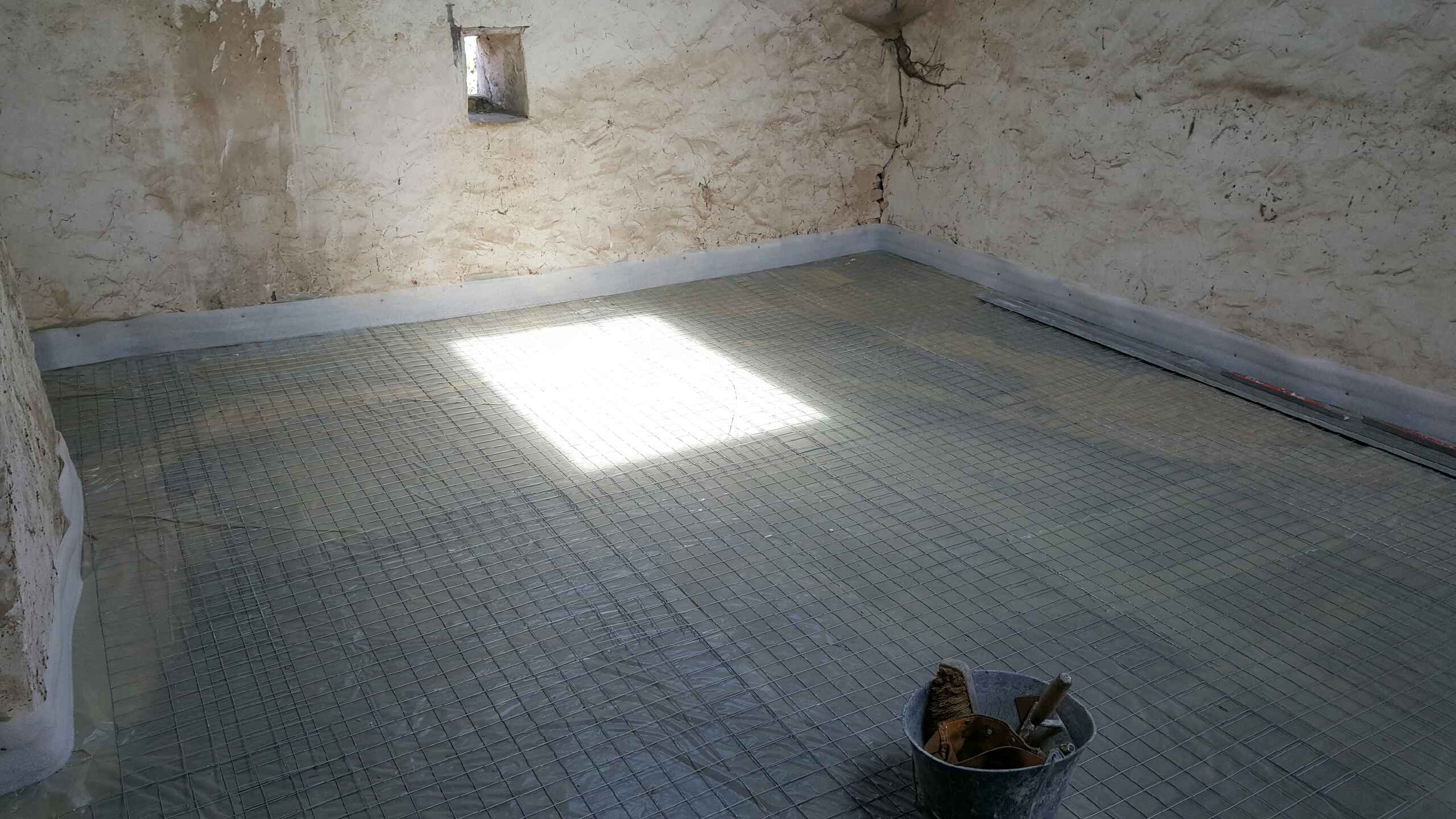 Ce sera une chape allégée, posée sur film polyane et armée de ferrailles. D’abord le maçon a nivelé un peu en cassant la chape précédente là où il y avait trop de surépaisseur.