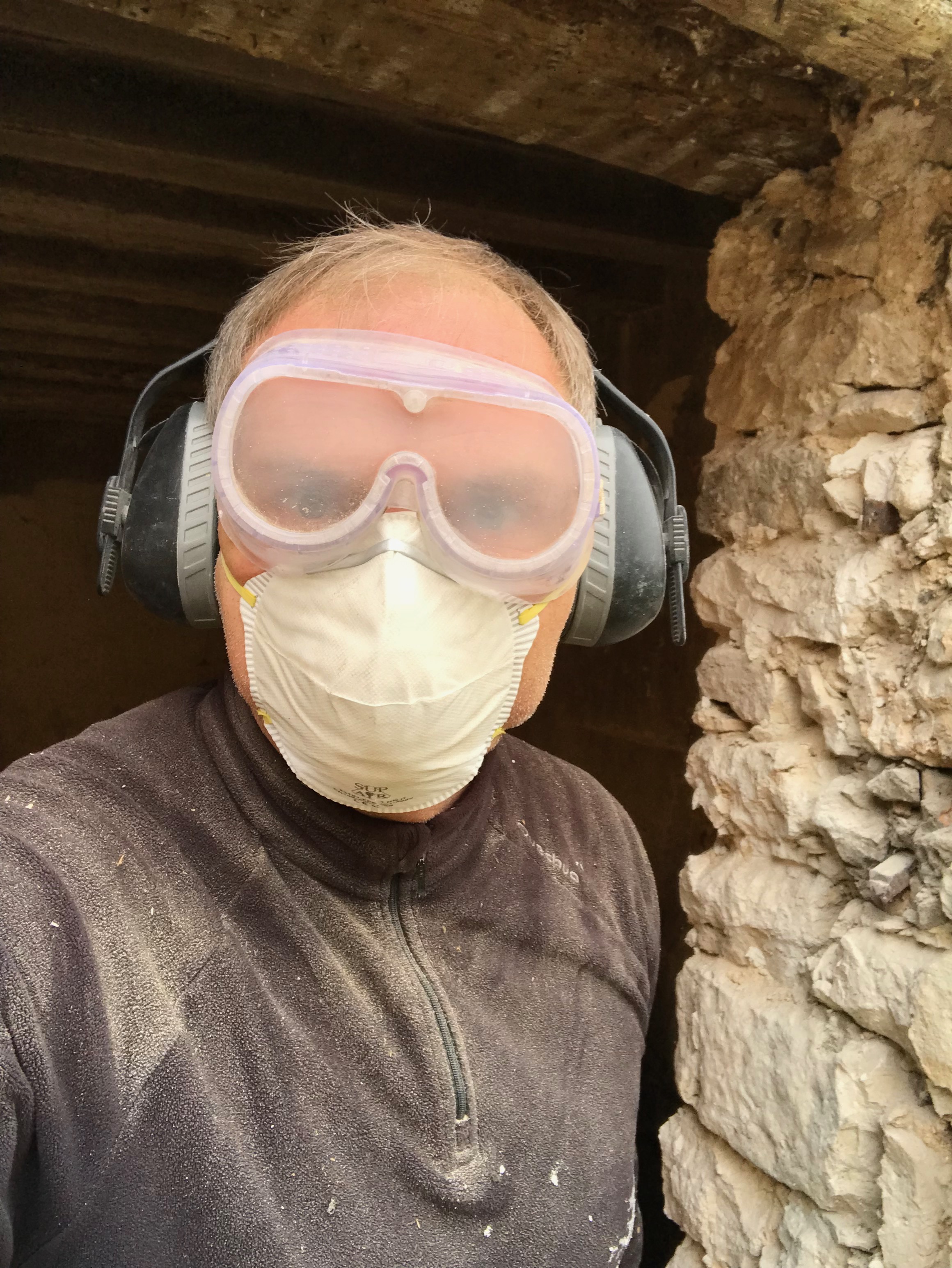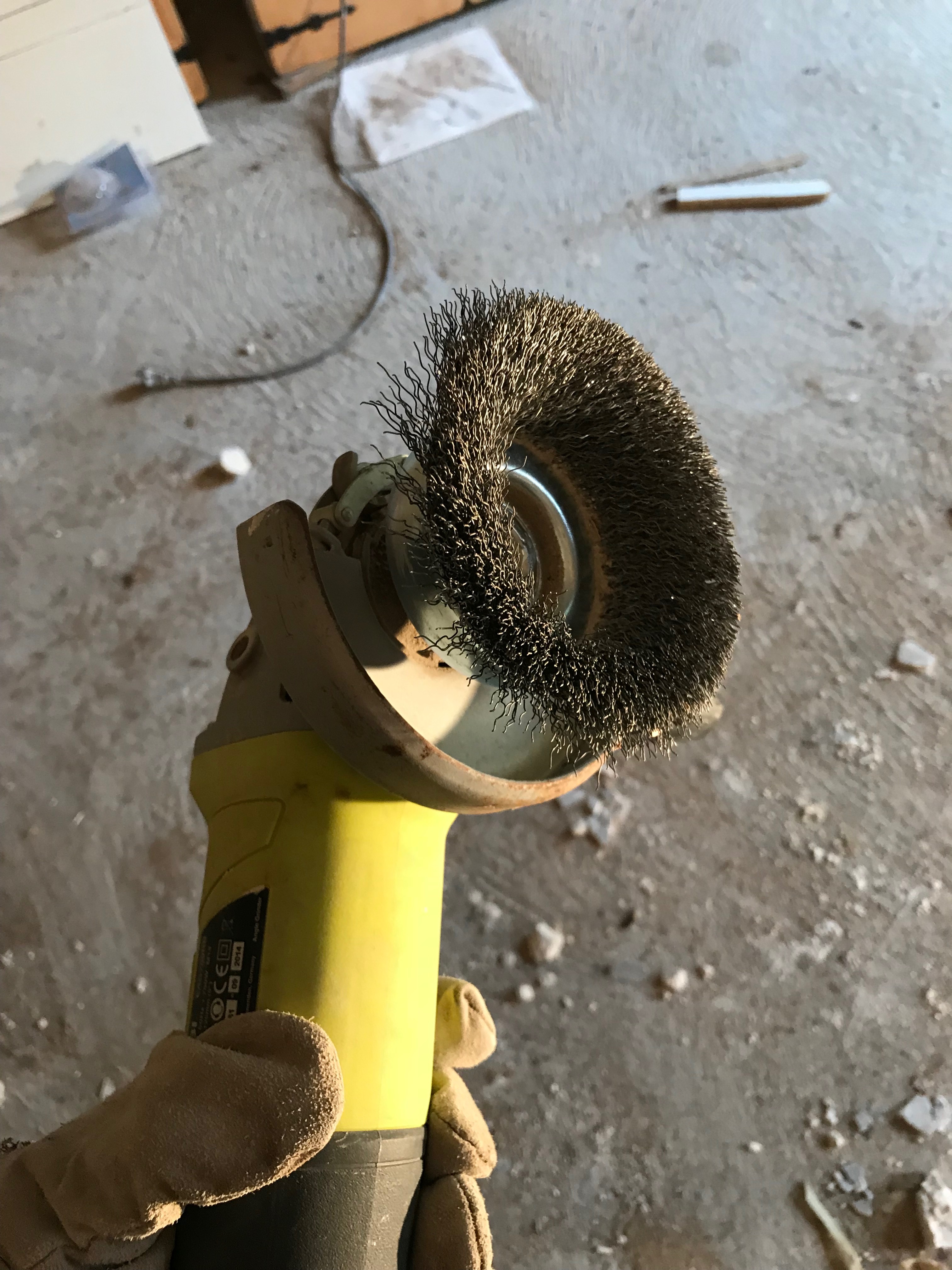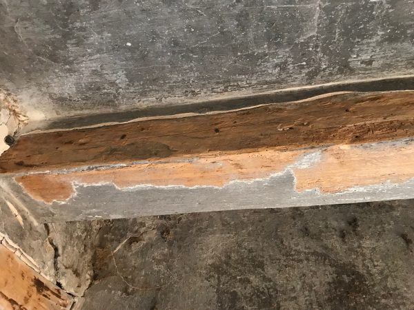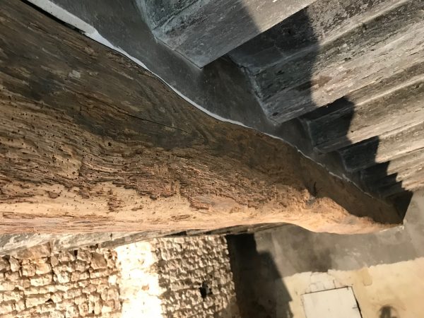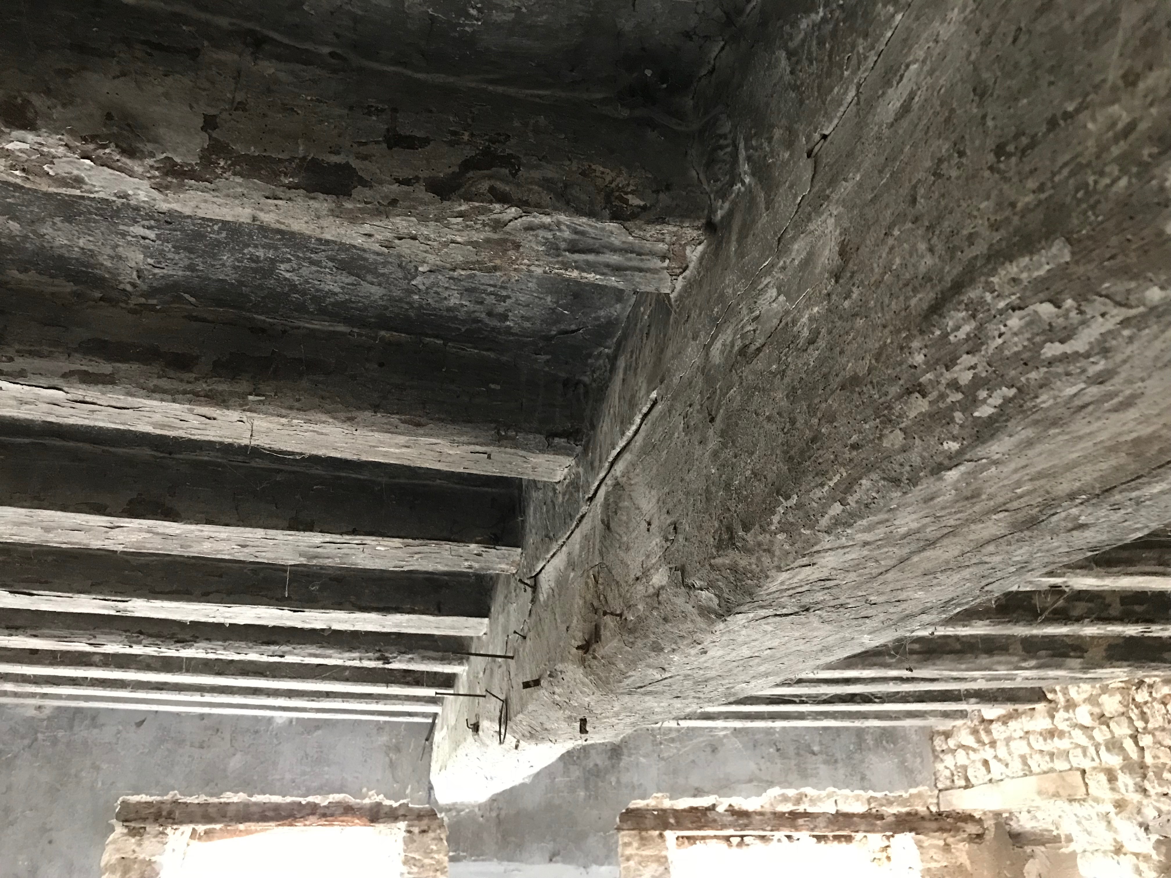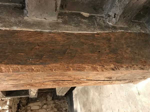 Avec une brosse métallique montée sur la meuleuse, je décape les poutres. O surprise, sous la couche de plâtre et de vieille peinture grise, il y a bel et bien du bois. La plupart du temps le bois est bien attaqué. Normalement les insectes n’attaquent que l’aubier, la partie la plus tendre, et ça ne remet pas en cause la résistance. Toujours la même devise, si ça a tenu 200 ans, ça en tiendra bien 200 de plus.??