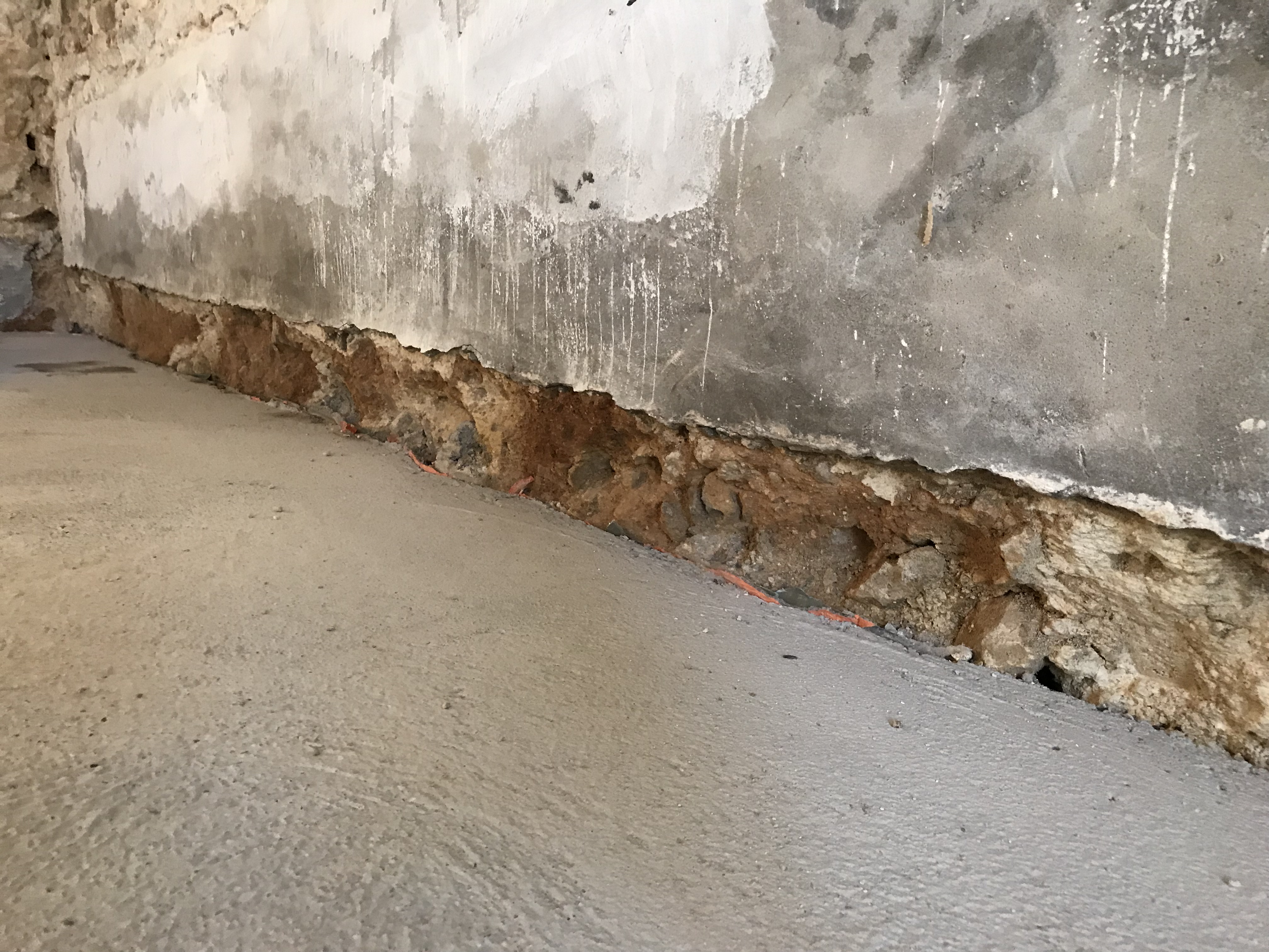 Je fais une grosse gâchée de mortier (8 seaux de sable, 3/4 de sac de ciment) afin de combler les trous au pied des murs. Je mets de l’impermeabilisant pour bloquer toute remontée d’eau.