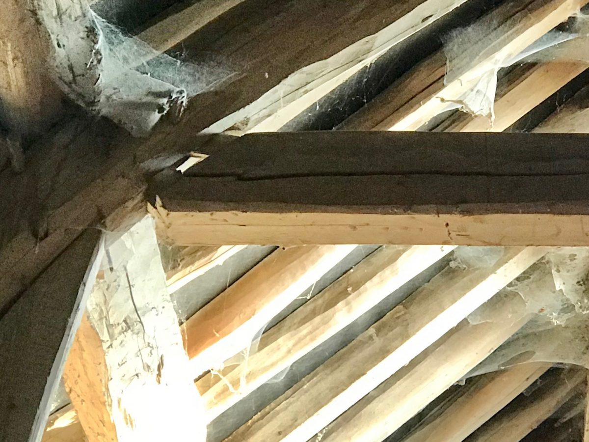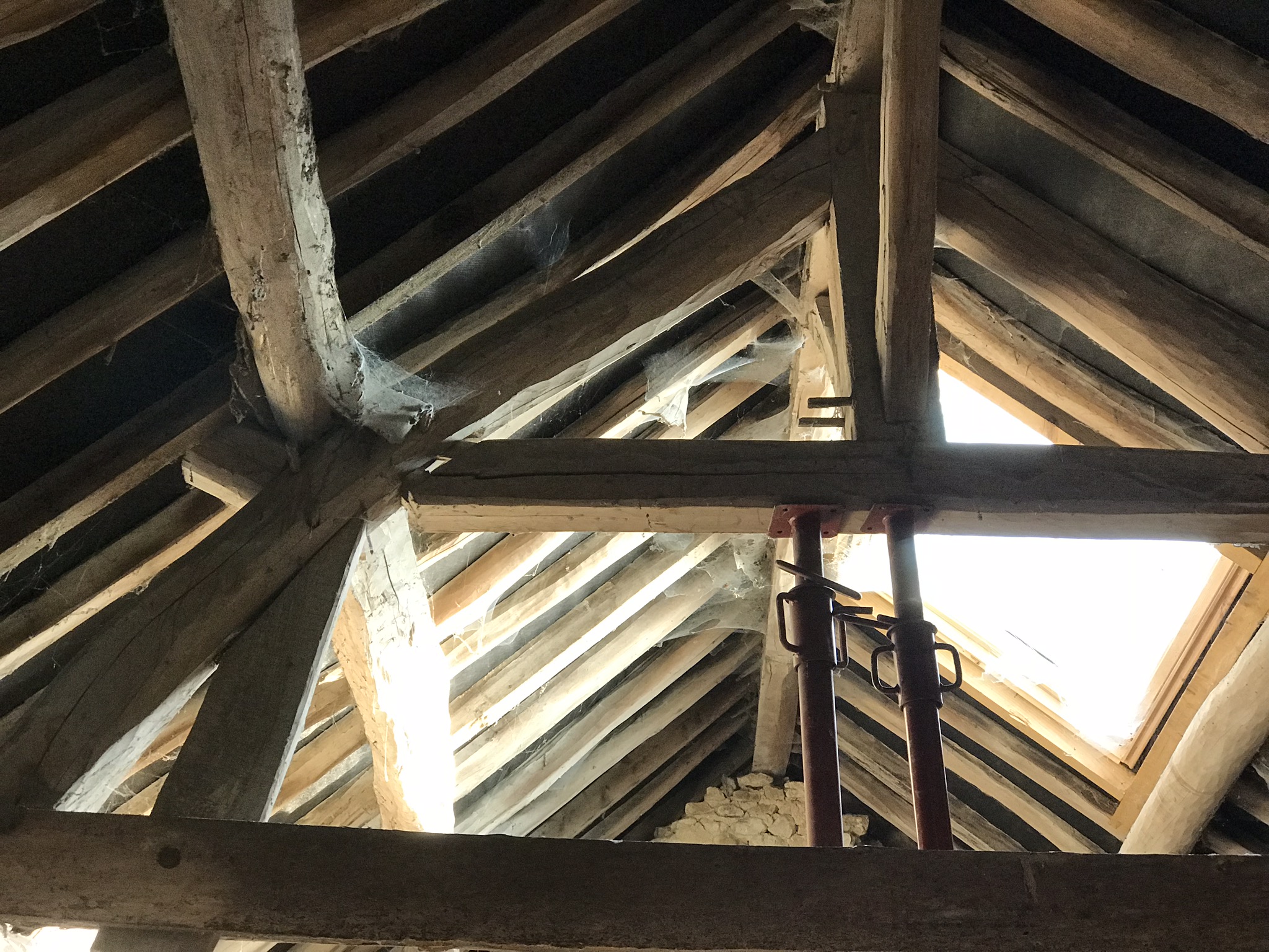 Dans la petite grange, le tenon qui relie l’entrait retroussé à l’arbalétrier a cassé sur une des fermes. Résultat, l’entrait s’est dégoncé et est sorti de plusieurs centimètre. J’ai posé un étai pour sécuriser l’ensemble. C’est à ce moment là que l’entrait a fait un gros crac et est sorti d’un cm de plus, car la à pose de l’étai a dû le faire bouger un petit peu. Après une petite sueur froide je place 2 autres étais pour bloquer l’ensemble. De quoi me décider à contacter un charpentier…