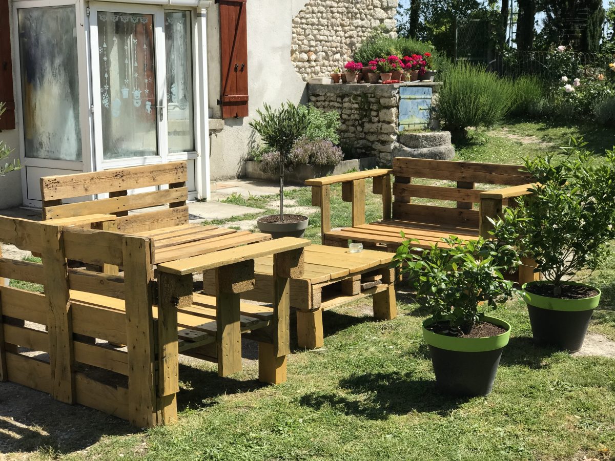 Je dispose de nombreuses palettes récupérées au cours de mes différentes livraisons de matériaux. Parmi ces différentes palettes, il y a un type particulièrement intéressant dit « Europalette » qui a l’extrême avantage d’être normalisé : Toutes les palettes font 80×120 cm, et épaisses de 15 cm, avec toutes le même nombre de traverses, de connecteurs, etc… Et ça c’est particulièrement intéressant pour des constructions diverses telles qu’un salon de jardin.
