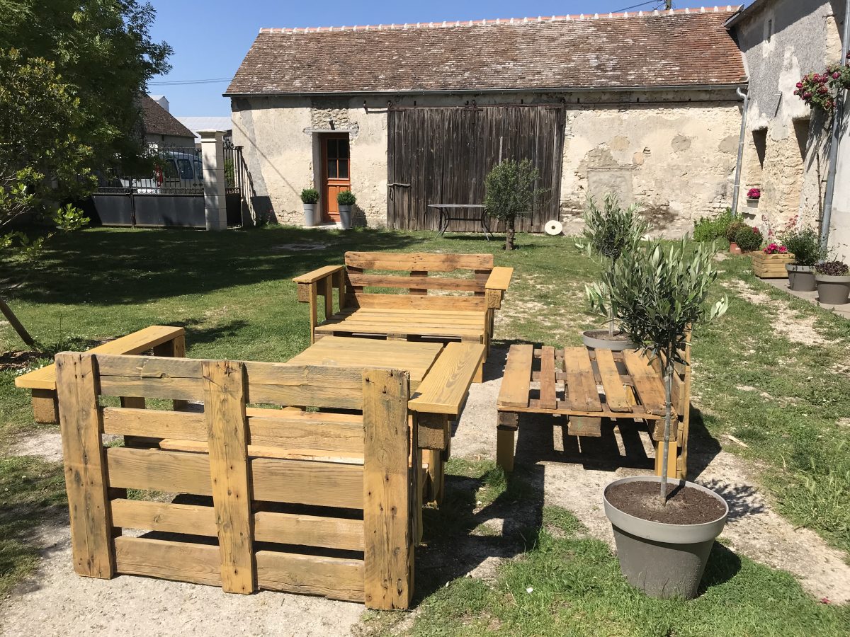 Disposant de 6 de ces palettes je décide de me lancer. J’arrive à créer une banquette/fauteuil avec 2 palettes et des poutres ou chevrons de récup’ pour faire les pieds. Je parviens aussi à faire des accoudoirs. Pour compléter le tout, je commande des coussins spécialement conçus pour cet usage qui viendront créer une assise et un dossier confortable. Hâte de les recevoir!