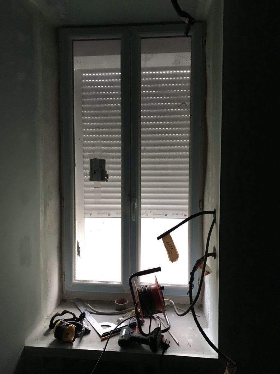 Je choisis de poser un volet roulant dans la salle de bain, dont la fenêtre donne sur la route. Compte tenu de la profondeur du cloisonnement, l’accès à un volet battant est quasi impossible, à moins de mesurer 1m90 et de se hisser sur la pointe des pieds, et je n’ai pas envie d’avoir la corvée de fermeture de ce volet tous les soirs.