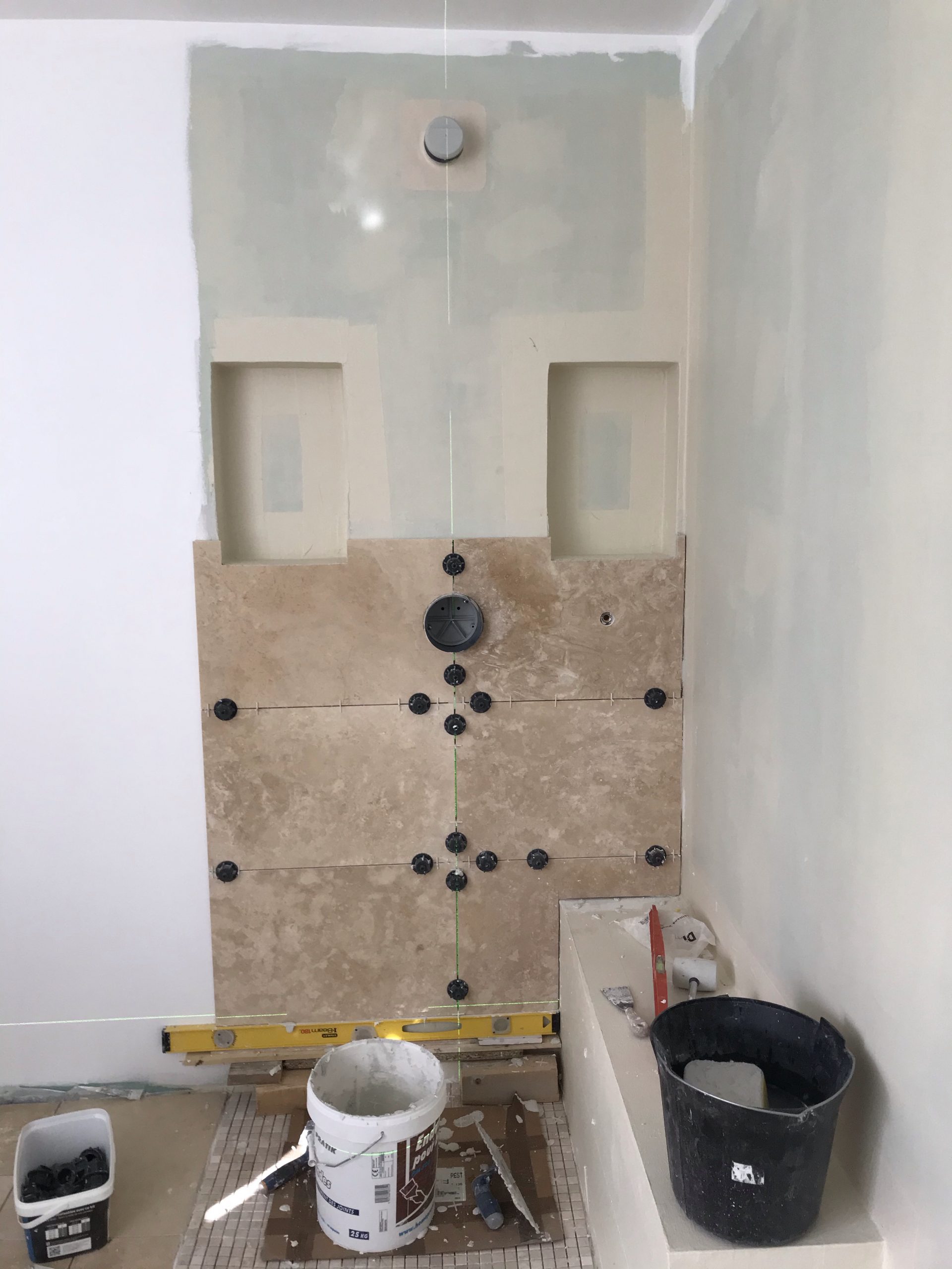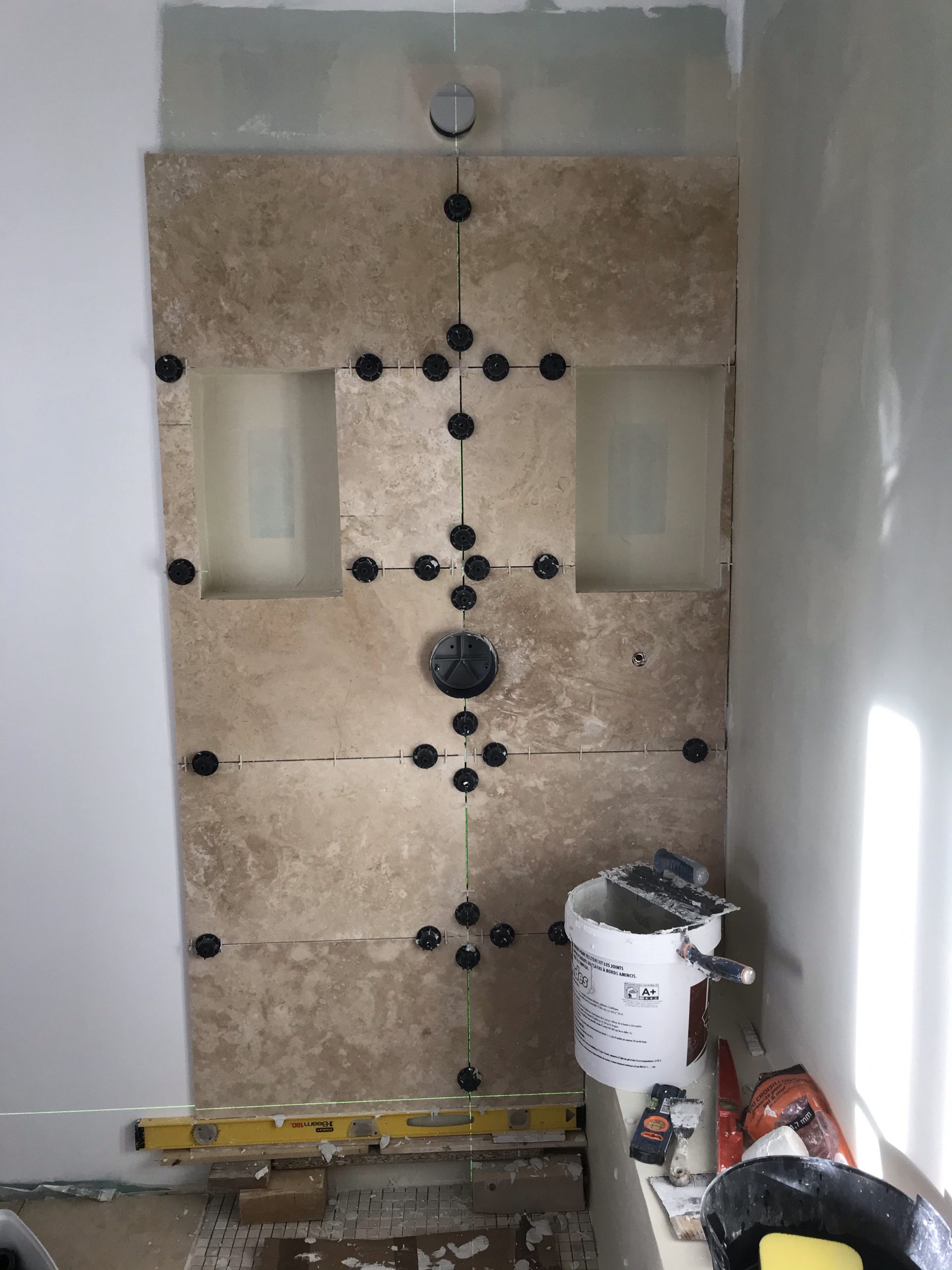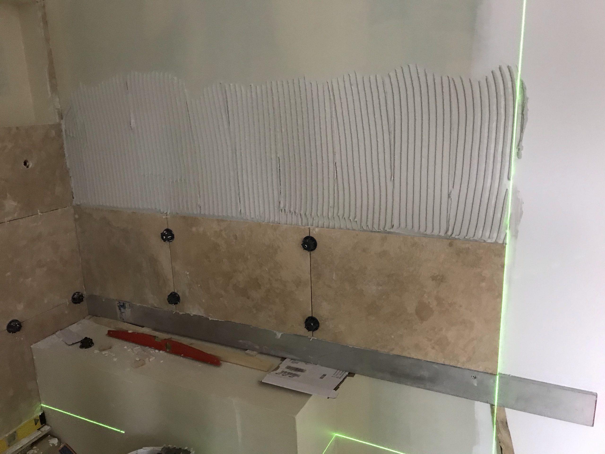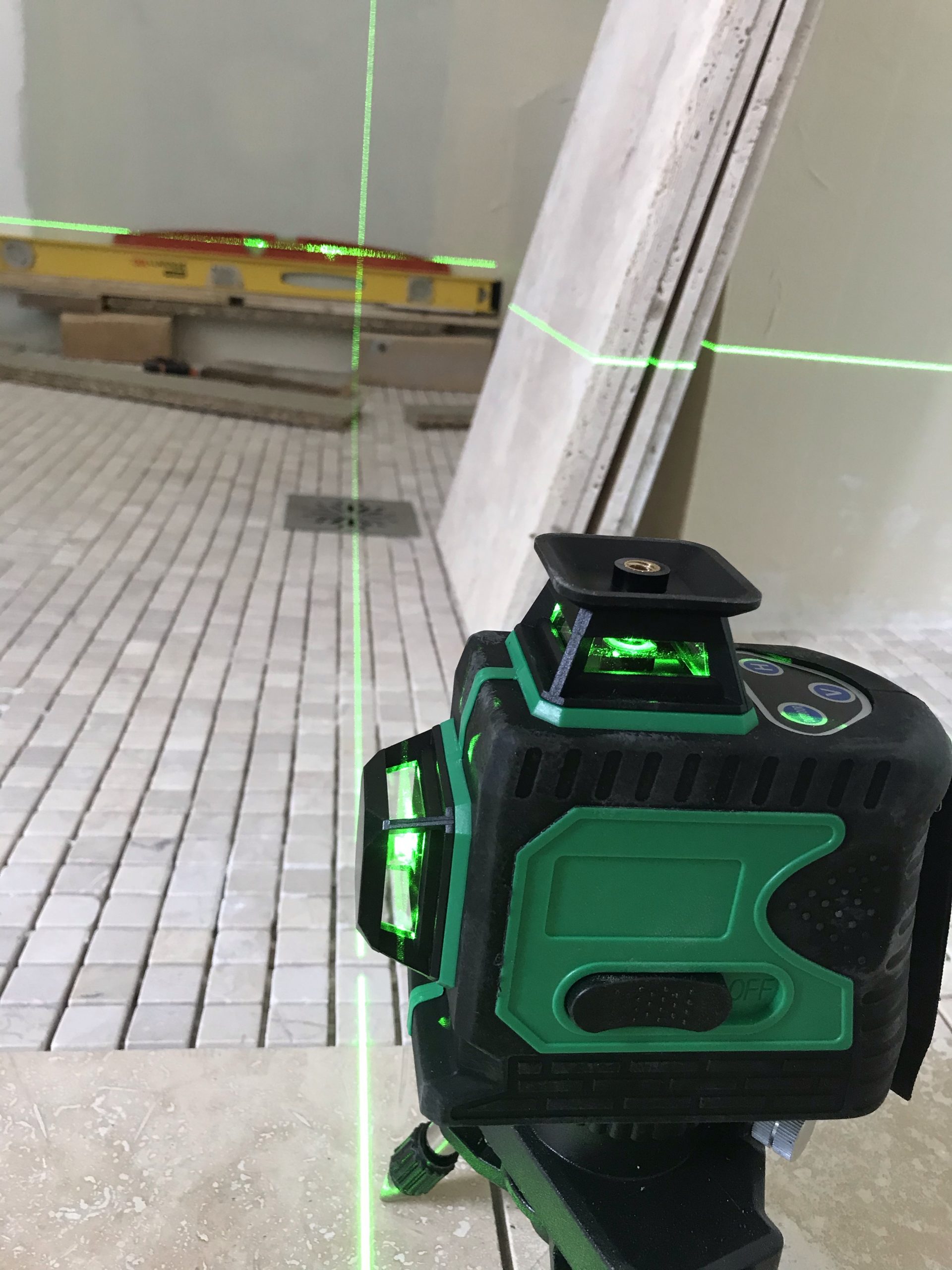 A l’occasion de la pose des carreaux sur la paroi de douche je me fends d’un nouveau niveau laser qui trace des lignes horizontales et verticales vertes. Super précis et pratique. Rien à voir avec mon précédent qui avait des allures de gadget.