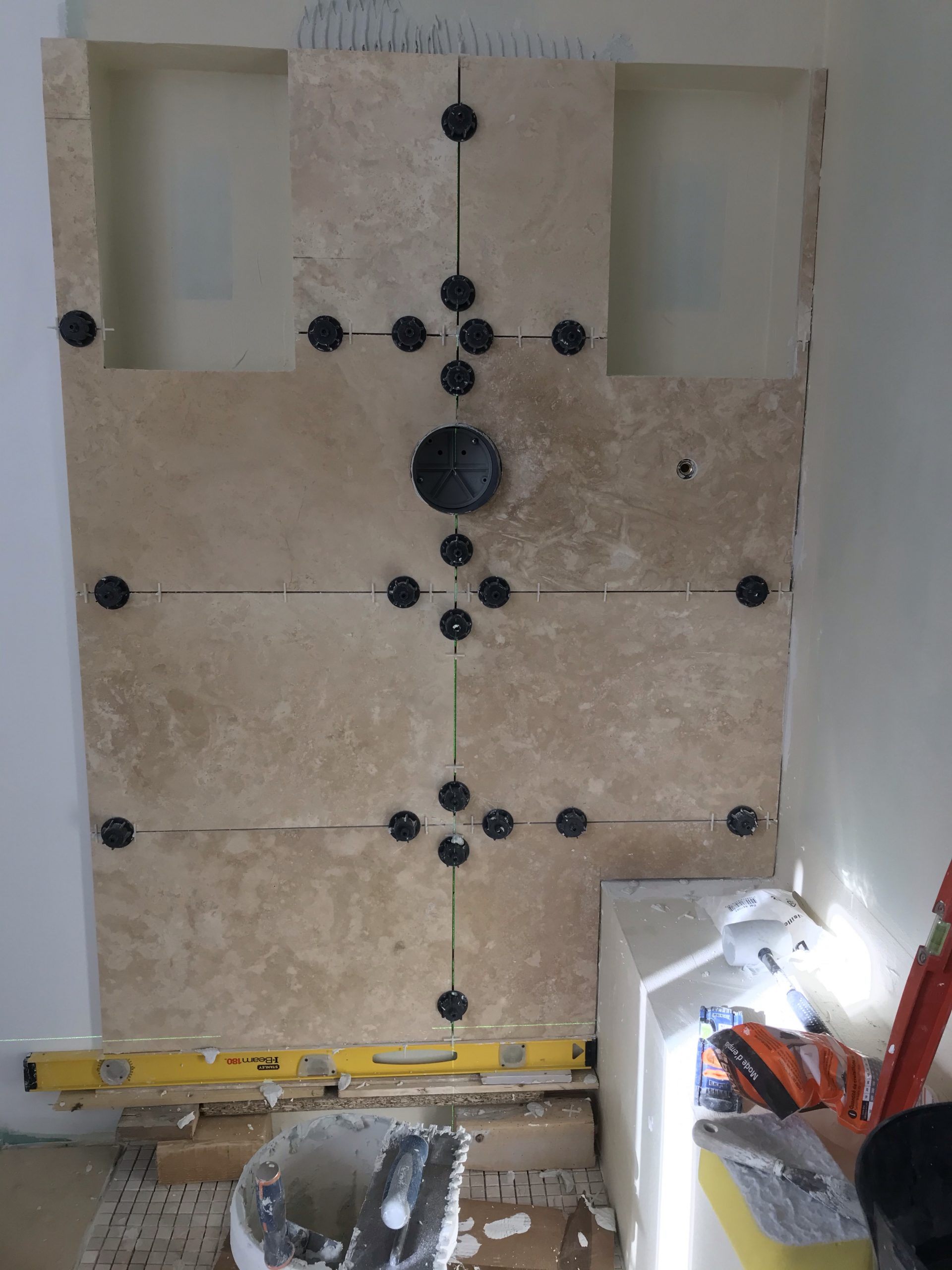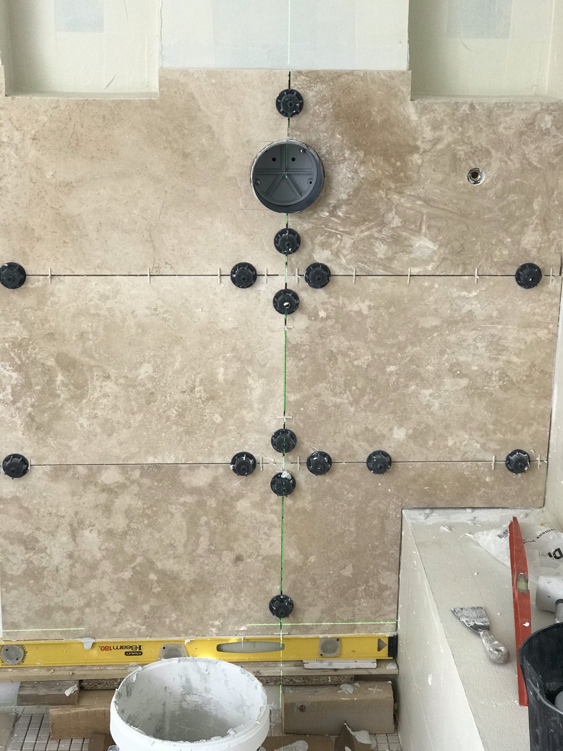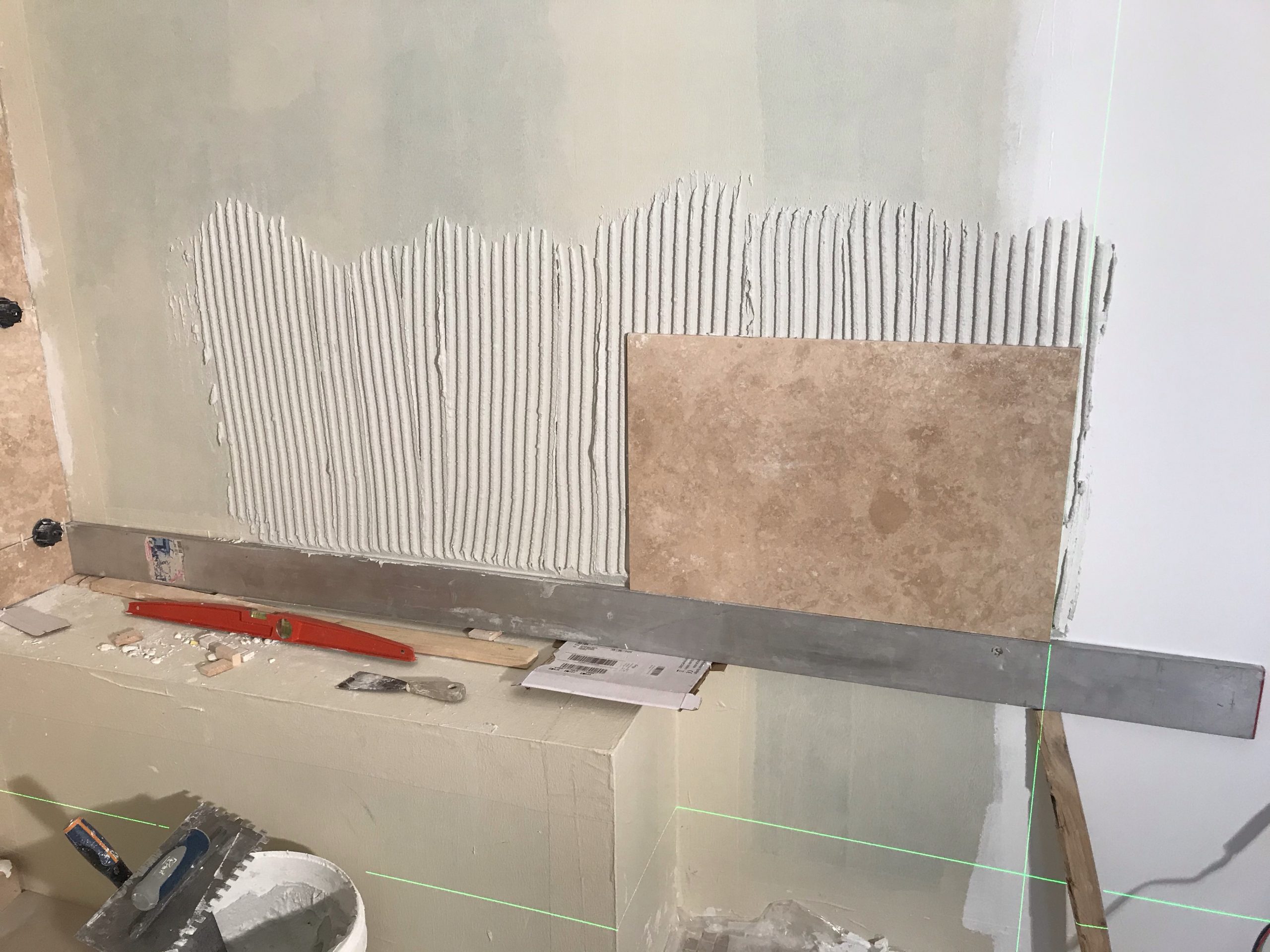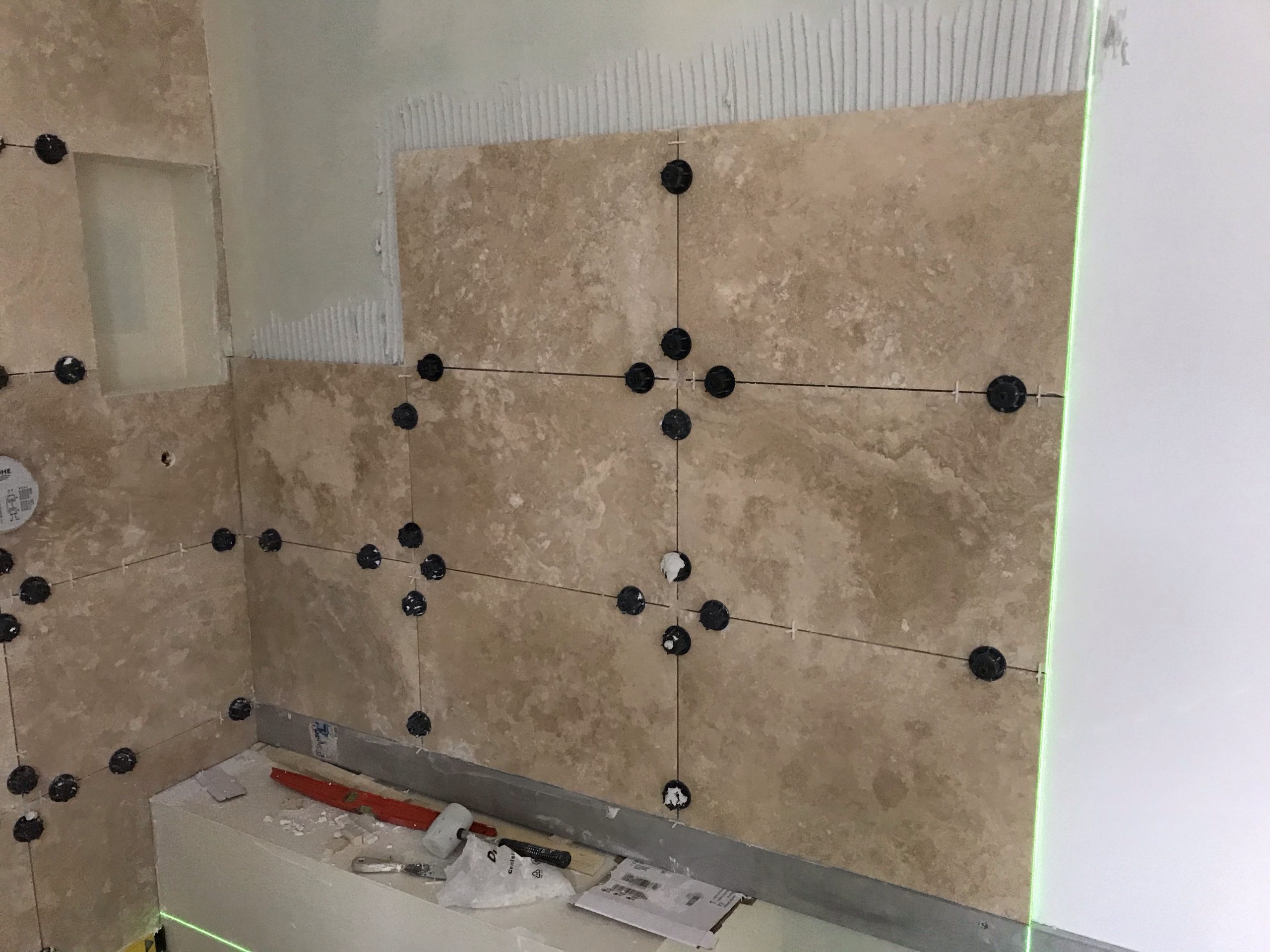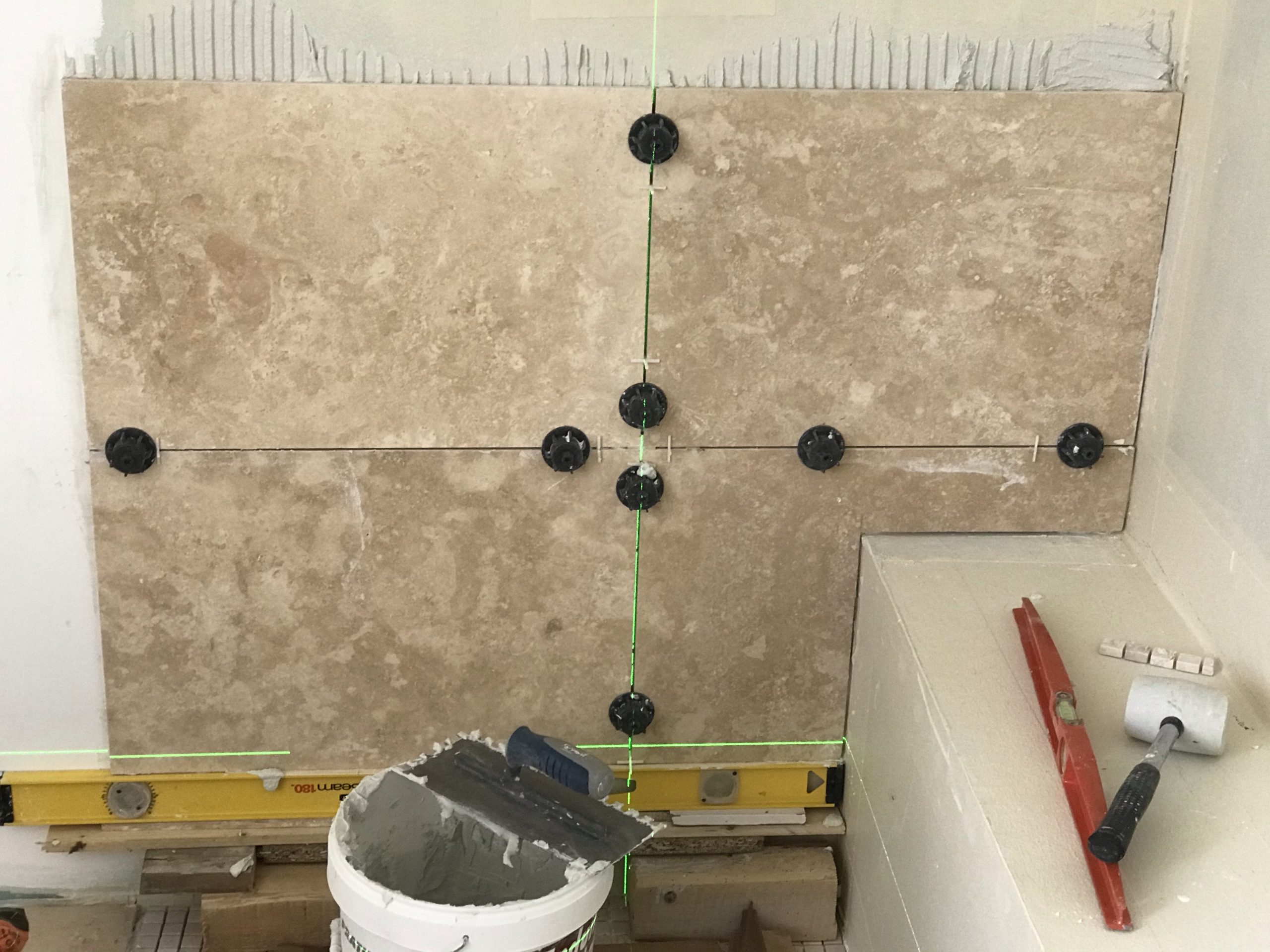 A l’occasion de la pose des carreaux sur la paroi de douche je me fends d’un nouveau niveau laser qui trace des lignes horizontales et verticales vertes. Super précis et pratique. Rien à voir avec mon précédent qui avait des allures de gadget.