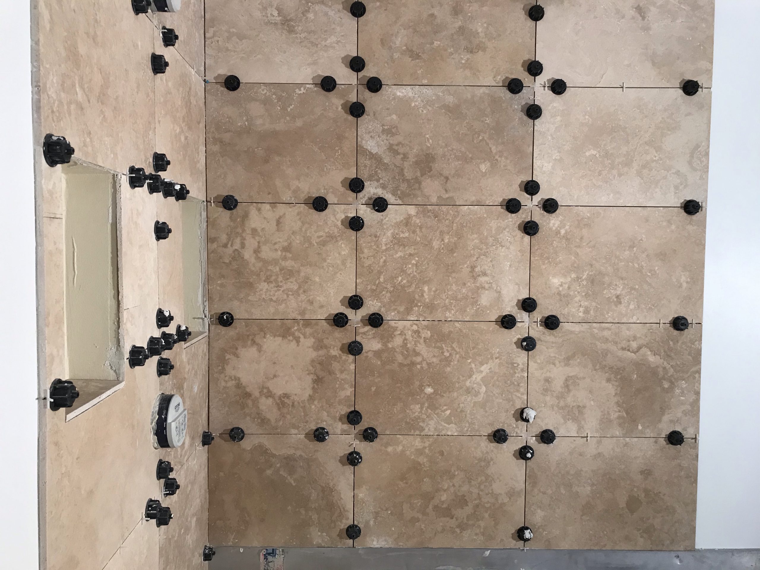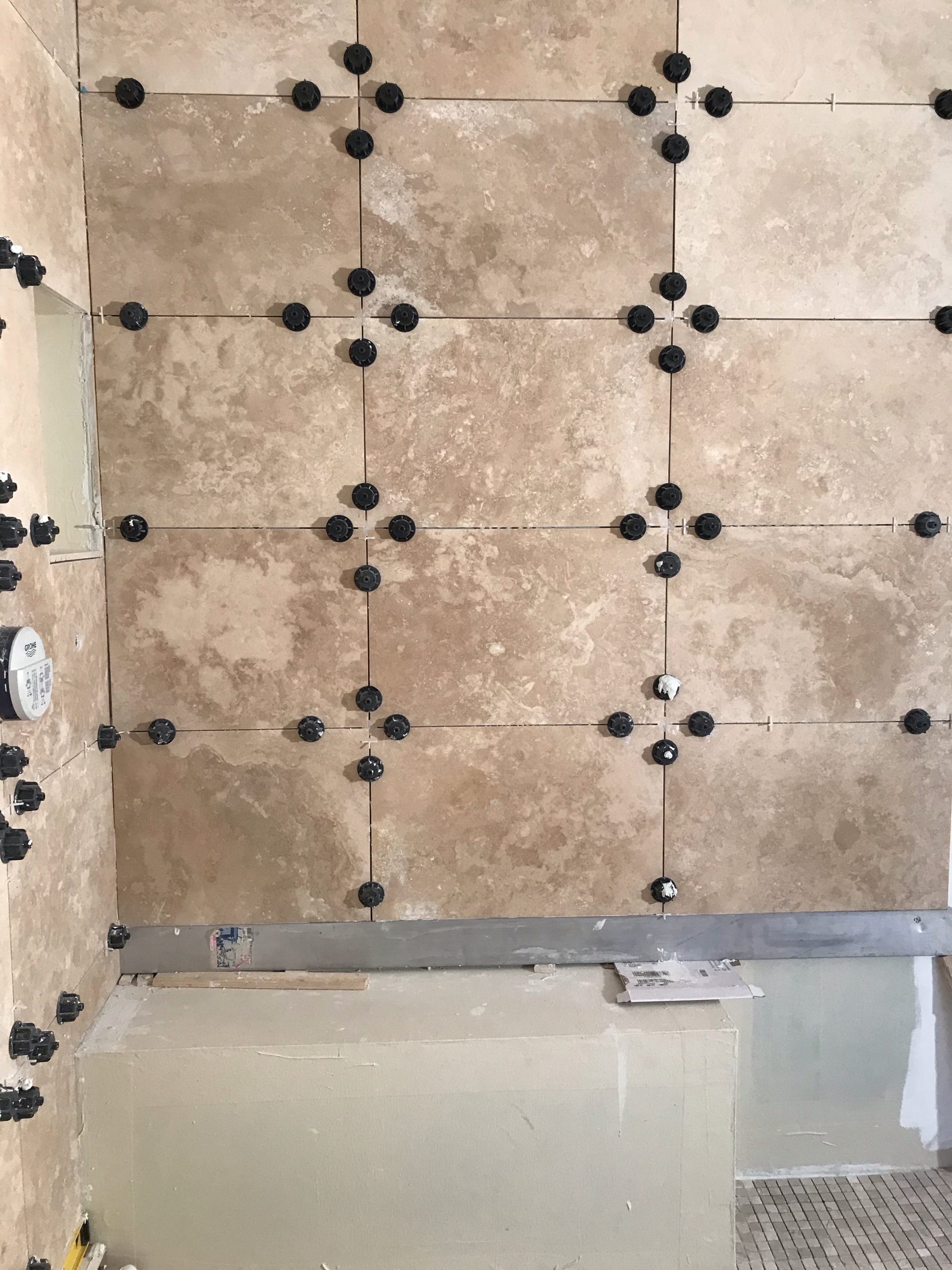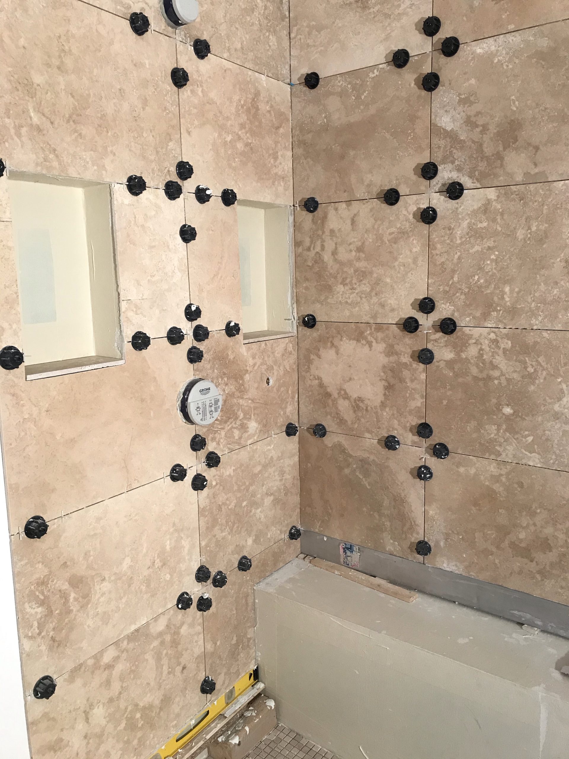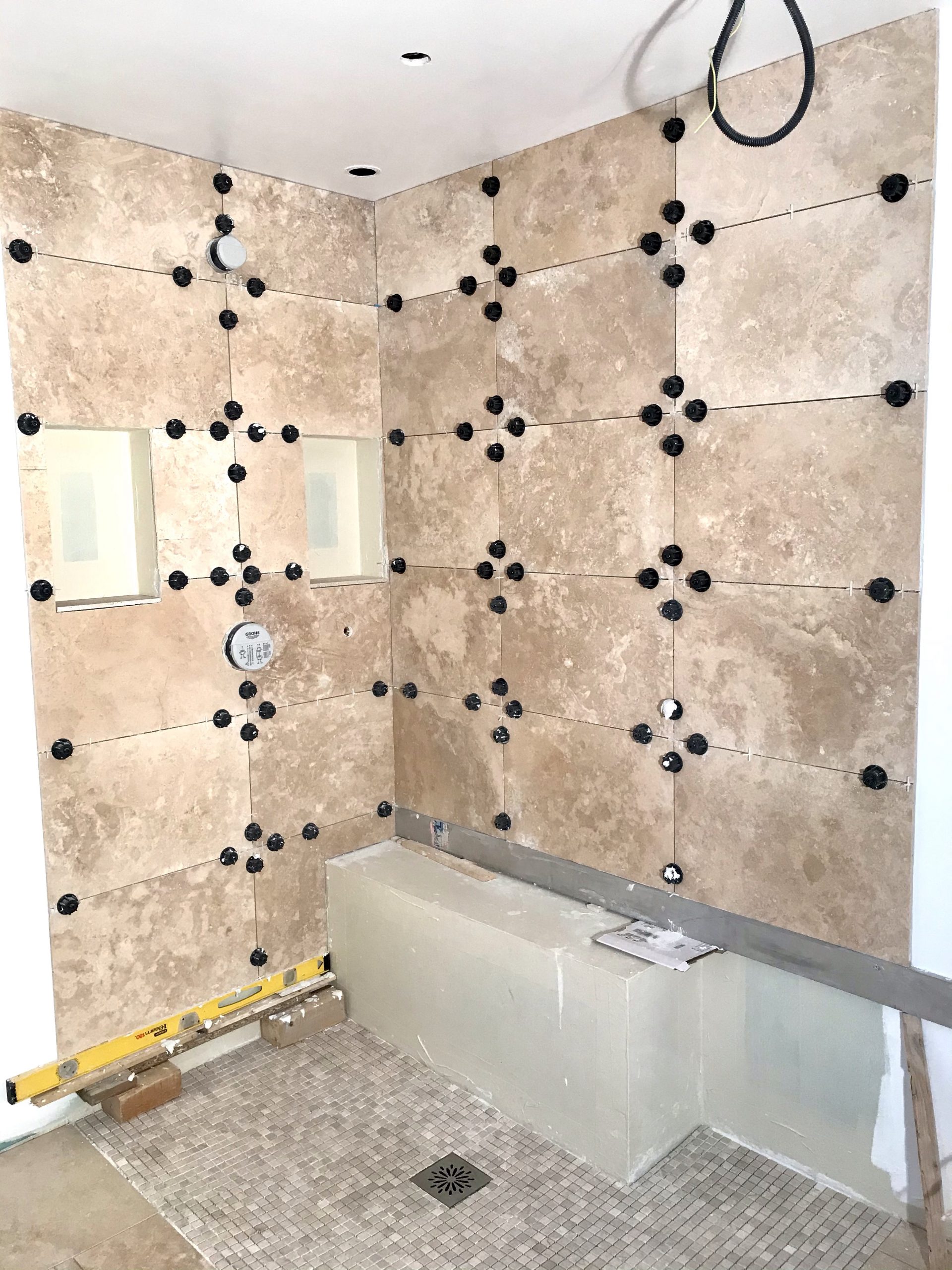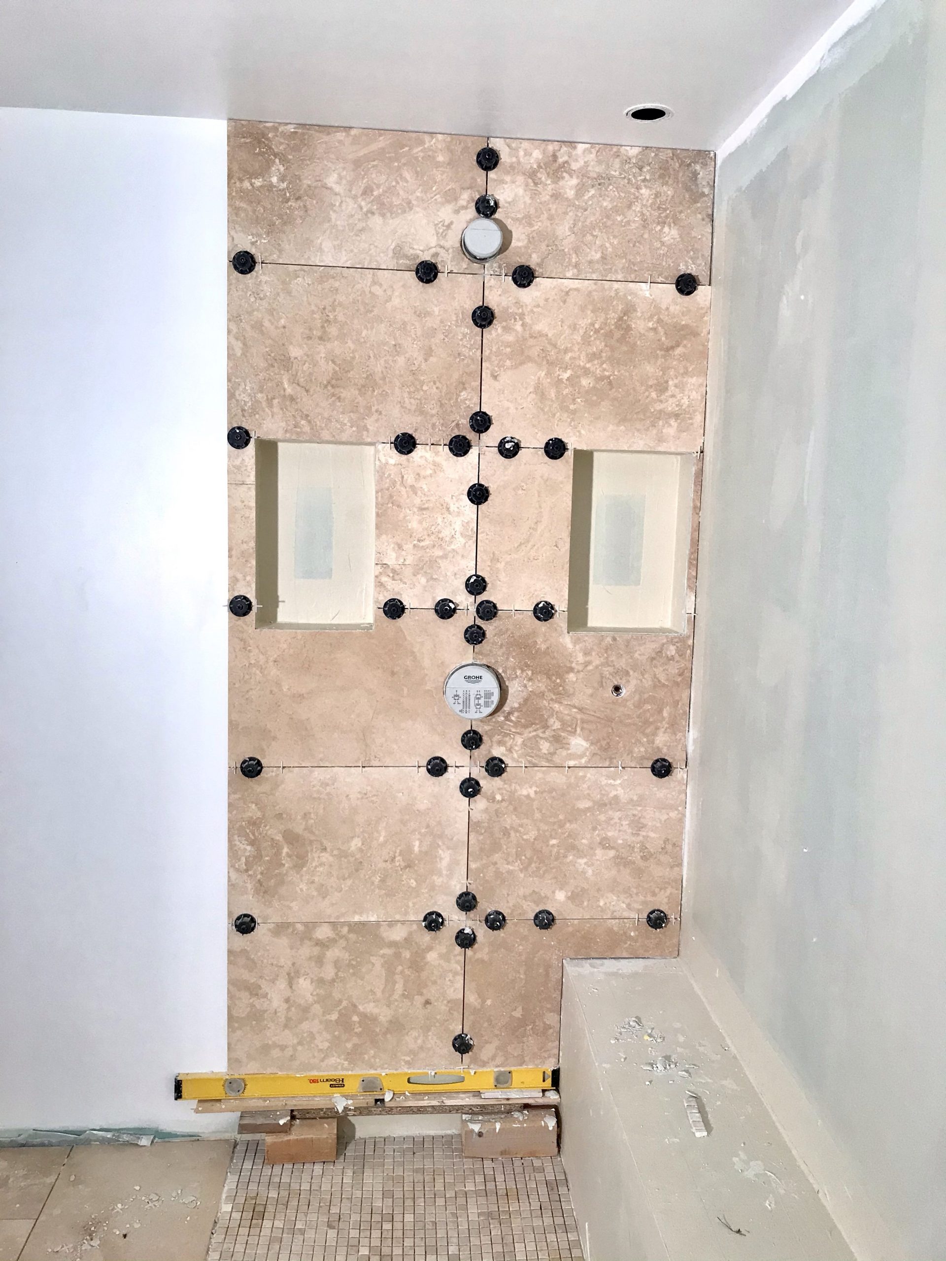 Le calepinage est affaire de compromis, pour éviter les découpes de moins d’un demi carreau au sol et au plafond ce qui est inesthétique, et enfin pour positionner les joints harmonieusement avec les éléments en place: niche, robinet et banquette.