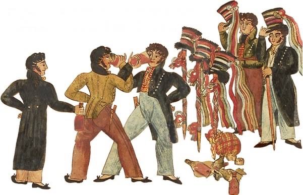 Parmi ces signes distinctifs, on retrouvait les couleurs fleuries, des rubans ornés de motifs floraux, qui étaient nouées autour du chapeau ou du cou. Celles ci pouvaient varier selon le corps de métier et les Sociétés. Ces rubans trouvaient leur origine dans les guildes médiévales, où ils étaient utilisés pour marquer l’apprentissage et l’identité de leurs membres.
