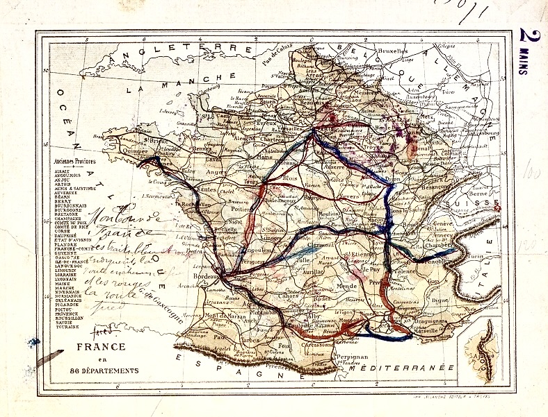 Comme on peut le voir dans les exemples projetés, les parcours des compagnons évitaient le centre de la France, la Bretagne, la Normandie et l’Est, probablement parce que les sociétés s’implantaient près des grands axes où la demande en main-d’œuvre qualifiée était constante.